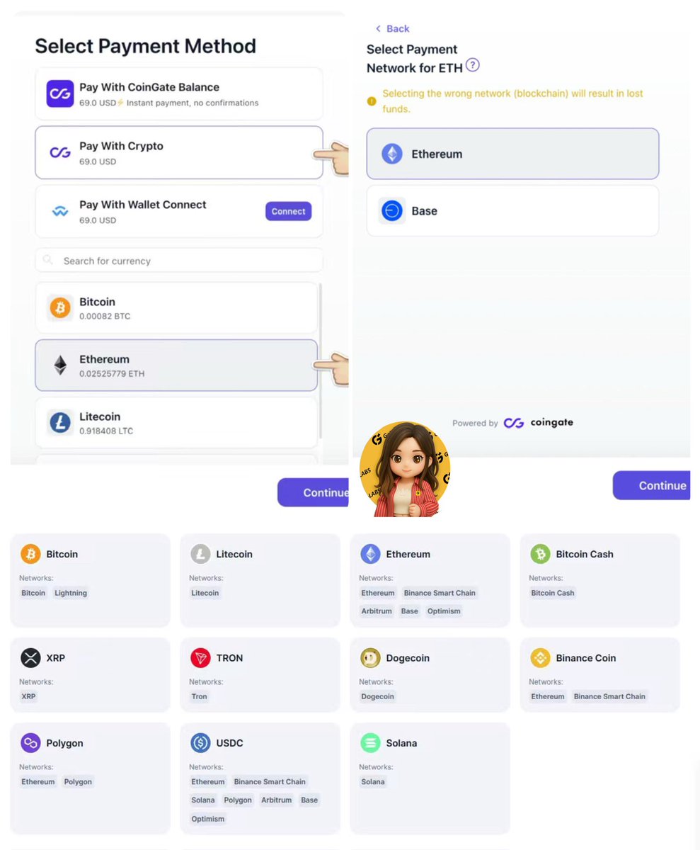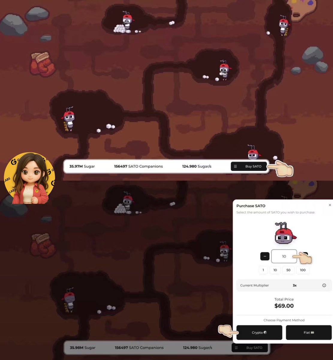 选择想买的 SATO 数量(最低 1 个,价格 $6.90/个),并挑选支付方式(支持 $KIN , $SUGAR 或主流代币)