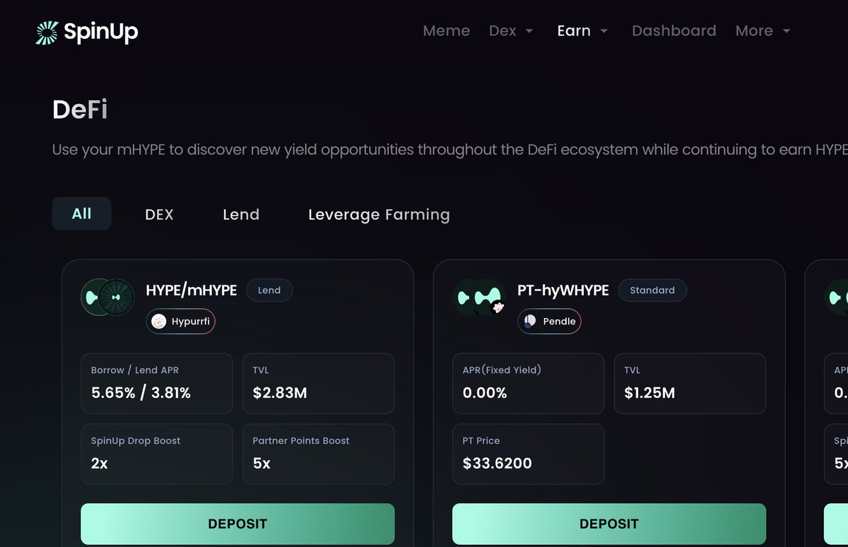 有 $Hype 的,想一个长期收益的 可以看看 @SpinUpZone 的Earn收益板块 目前最高的Hype/mHYPE 可以有接近4的年化收益 最高的话可以拿到76%的复合年化收益率 同时赚取空投积分和合作伙伴积分 相当于我理解有点一鱼四吃 大家关注一下 🙋如何参与 1、用户质押 HYPE 后获得$mHYPE代币,当前兑换比例约为1 mHYPE ≈ 1.01285 HYPE 2、将对应的流动性投入到池子中即可 3、开启躺赚 📊积分相关的空投预期比较建议大家重点关注 1、,明确的是积分可以兑换 $SUP 代币空投 2、积分获取方式主要有4种: - 质押积分:每小时获得2个Drops,持续质押 $mHYPE - DeFi增强:在合作伙伴协议提供流动性,每小时获得3+个Drops - 推荐奖励:获得被推荐人10%的质押积分 - 社交活动:Kaito活动额外积分奖励 ➡️大家对于Hyperliquid生态不熟悉的 可以小资金尝试一下 然后逐步增大仓位 从大周期来看 去中心化明显是趋势,而Hyperliquid及其龙头,肯定是其中重中之重需要关注的项目