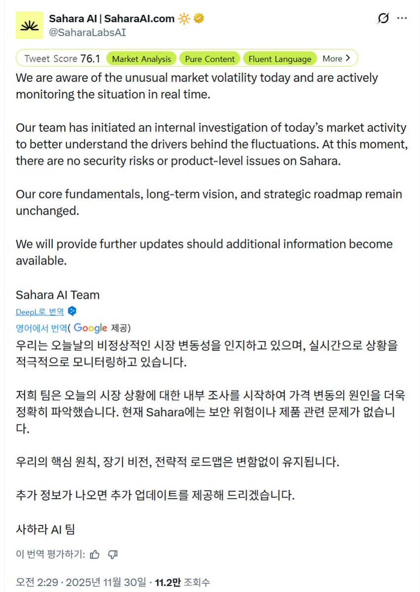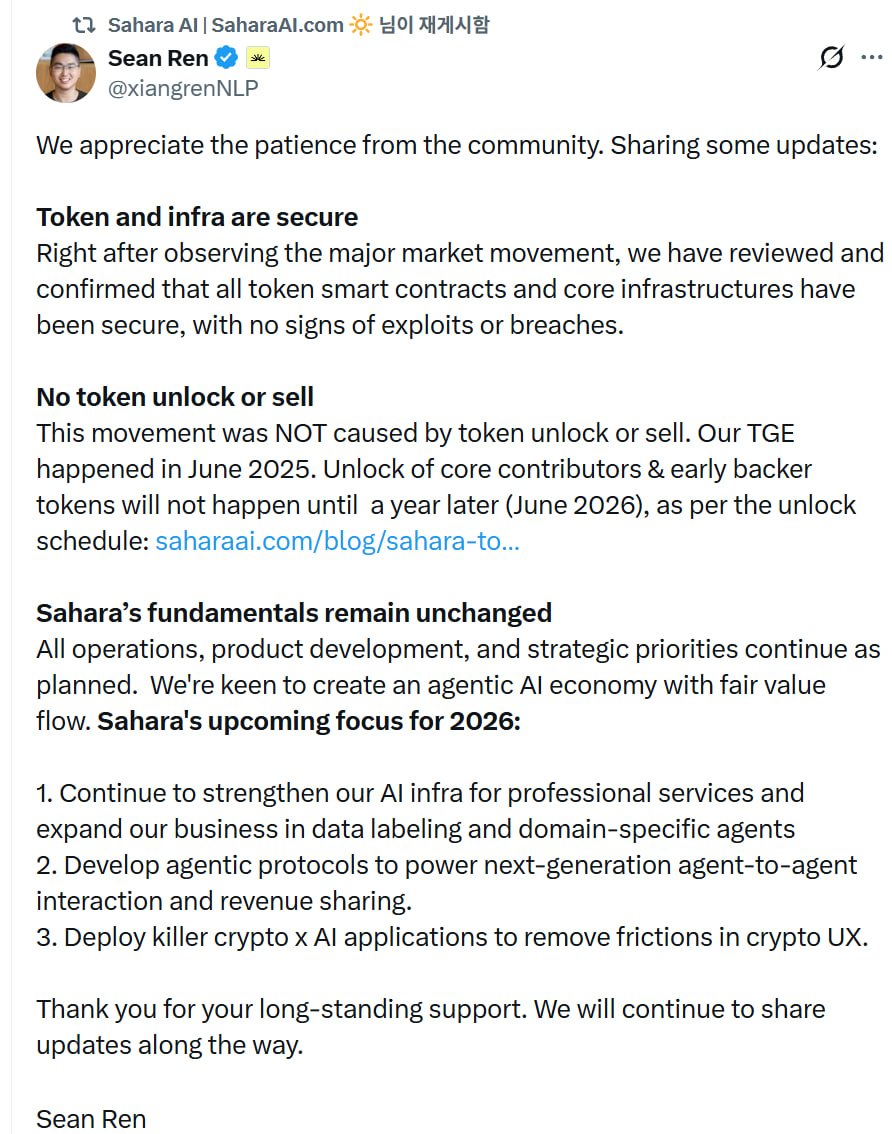 $SAHARA 급락에 대한 팀의 입장 발표 1. Sahara 공식 계정 - 오늘 비정상적인 변동성 인지하고 모니터, 조사했음 - 결과 : 현재 Sahara에는 보안 위험이나 제품 관련 문제 없음 2. 관련해서 SAHARA 공식 계정이 팀원들 트윗도 리트윗 중 - 투자자, 팀물량 언락은 26년 6월 26일 부터 풀림 - 내부자 언락 아님 💬 보통 저런 가격움직임 나오면 우리 마케팅 파트너 or MM 이 계약위반하고 던졌어요! 이런식으로 해명하는게 국롤인데 사하라는 당당하네요..