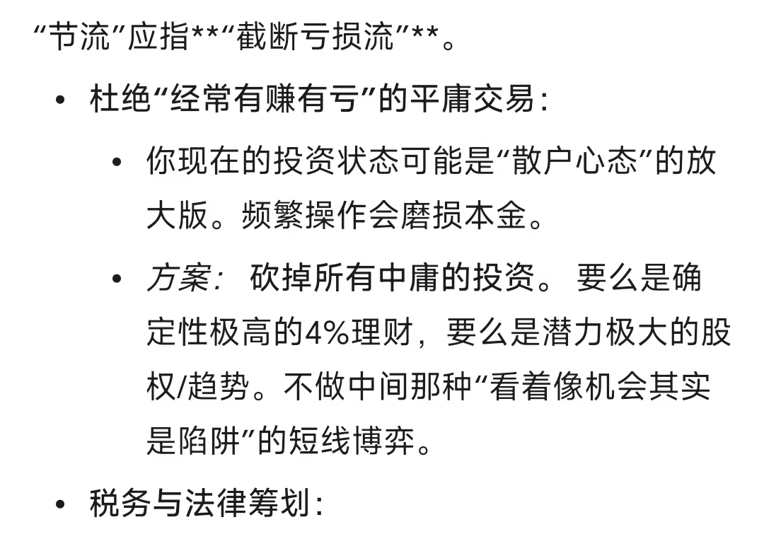 这两天在利用 Gemini 复盘自己的交易,其中我提到一个问题,那就是开源节流。他这里一段建议给我很大的启发,那就是重新定义“节流” (Cost Control)。简单的话来说,就是——如果要做非凡之事,就要摒弃平庸 对于目前这个资产阶段的人,省咖啡钱毫无意义。你的 “节流” 应指 “截断亏损流” 👉 杜绝 “经常有赚有亏” 的平庸交易: - 你现在的投资状态可能是“散户心态”的放大版。频繁操作会磨损本金 - 方案: 砍掉所有中庸的投资 要么是确定性极高的 4% 理财,要么是潜力极大的股权 / 趋势。不做中间那种 “看着像机会其实是陷阱” 的短线博弈 举例来说,就是昨天的 $SAHARA 短线抄底之后差点亏,我是想明白了空单被 ADL 之后会有一大批割肉盘抛压的,为了赌项目方要脸给公告我还是做了一波。这笔交易顶多就是反弹到 0.5,但向下空间巨大。熊市遇到这样的机会,买 5 万刀赚 10% 但有可能亏 50%,出手的意义非常小。在做每笔交易之前都得想好盈亏比,对理性要求比较高 跟 Gemini 聊过之后,我最大的启发就是不要 overtrading。我对这句话的理解是很深的,但具体到操作上经常管不住手。AI 做到的其实是帮助更加系统化地思考这件事的前因后果
