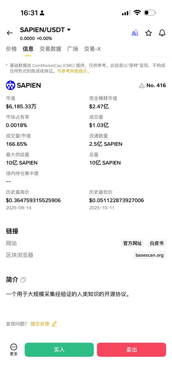Sapien 是一个将人类智慧转化为 AI 训练数据的去中心化协议,获选为币安第 57 期 HODLer 空投项目,并于 今日16点在币安现货上线。 SAPIEN 总供给 10 亿枚,初始流通 2.5 亿枚(25%) 币安此次「回溯式」空投 1 500 万枚 SAPIEN,面向 10 月 20-23 日持有并申购 BNB 理财/链上赚币产品的用户发放。