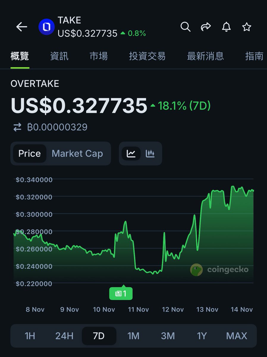 😎之前分享很多次的项目 @overtake_world ,目前 $TAKE 价格0.17U。代币上线后变现还不错。