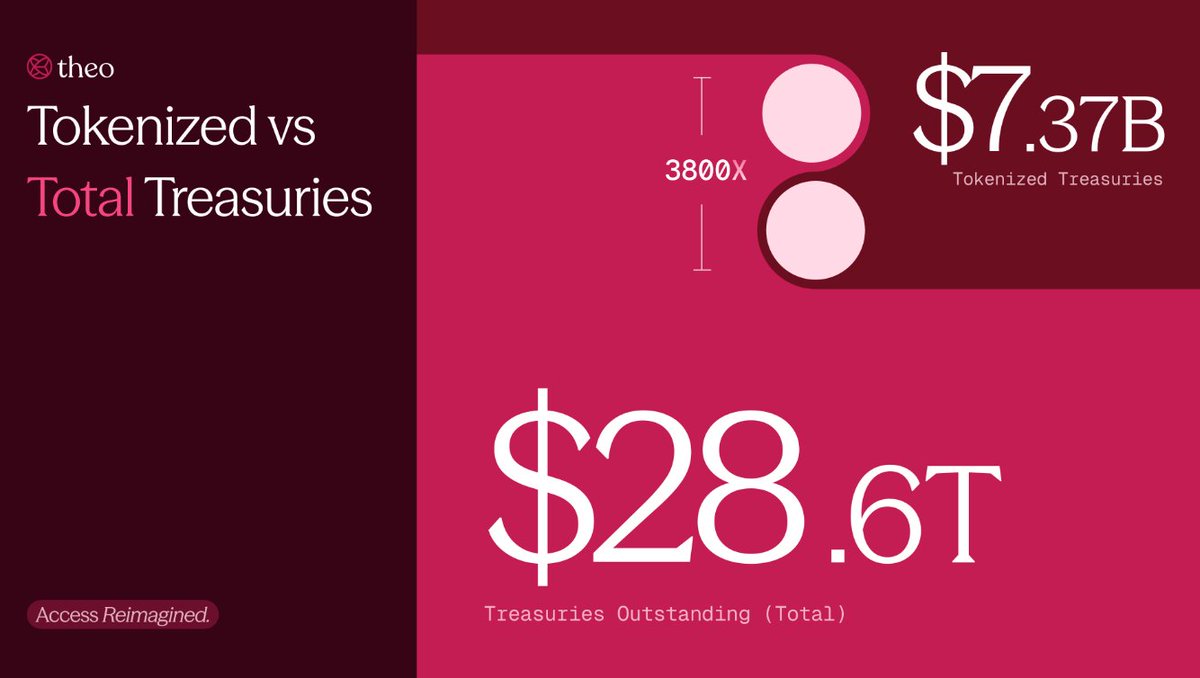 3800 倍的增长真空与 Theo 的“基建计划” Theo Network @Theo_Network 刚刚发布了一张很具有对比度的数据图,向市场抛出了一个万亿级的问题:为什么 RWA 喊了这么多年,连传统金融的零头都没做到? ■ 3800X 的差距:被误读的蓝海 数据不会说谎,上面这图揭示了 RWA 赛道目前最真实的尴尬与机遇: ❌Tokenized Treasuries (链上国债):目前仅约 $73.7 亿 ✅Total Treasuries (存量国债):高达 $28.6 万亿 目前的链上 RWA 规模仅占传统市场的 0.02%, 这意味着,即使只把 1% 的传统国债搬上链,现有市场规模也将暴涨 50 倍;如果要完全对齐,则是 3800 倍 的恐怖空间 ■ 为什么资金进不来? 既然金矿就在那里,为什么这 $28.6T 的资金迟迟不进场?Theo 一针见血地指出了核心症结:发行不等于市场 目前的 RWA 产品大多陷入僵尸代币陷阱: ❌流动性枯竭:大户想买买不到,想卖卖不掉,只能走繁琐的 T+1 赎回流程 ❌资金效率低:买了国债代币就等于锁死了流动性,无法像 DeFi 原生资产那样进行循环借贷或加杠杆 ■ Theo 的破局:不止于发行 (Beyond Issuance) ✅把“市场结构”搬上链: Theo 引入了传统高频交易(HFT)的做市商逻辑,这意味着资产(如 thBILL)一上线就自带深度流动性,不再是被动等待买家 ✅打通 Morpho、Pendle 等 DeFi 协议,让 RWA 资产不仅仅是生息资产,更是优质抵押品 (Collateral) $Theo #RWA #Macro #DeFi