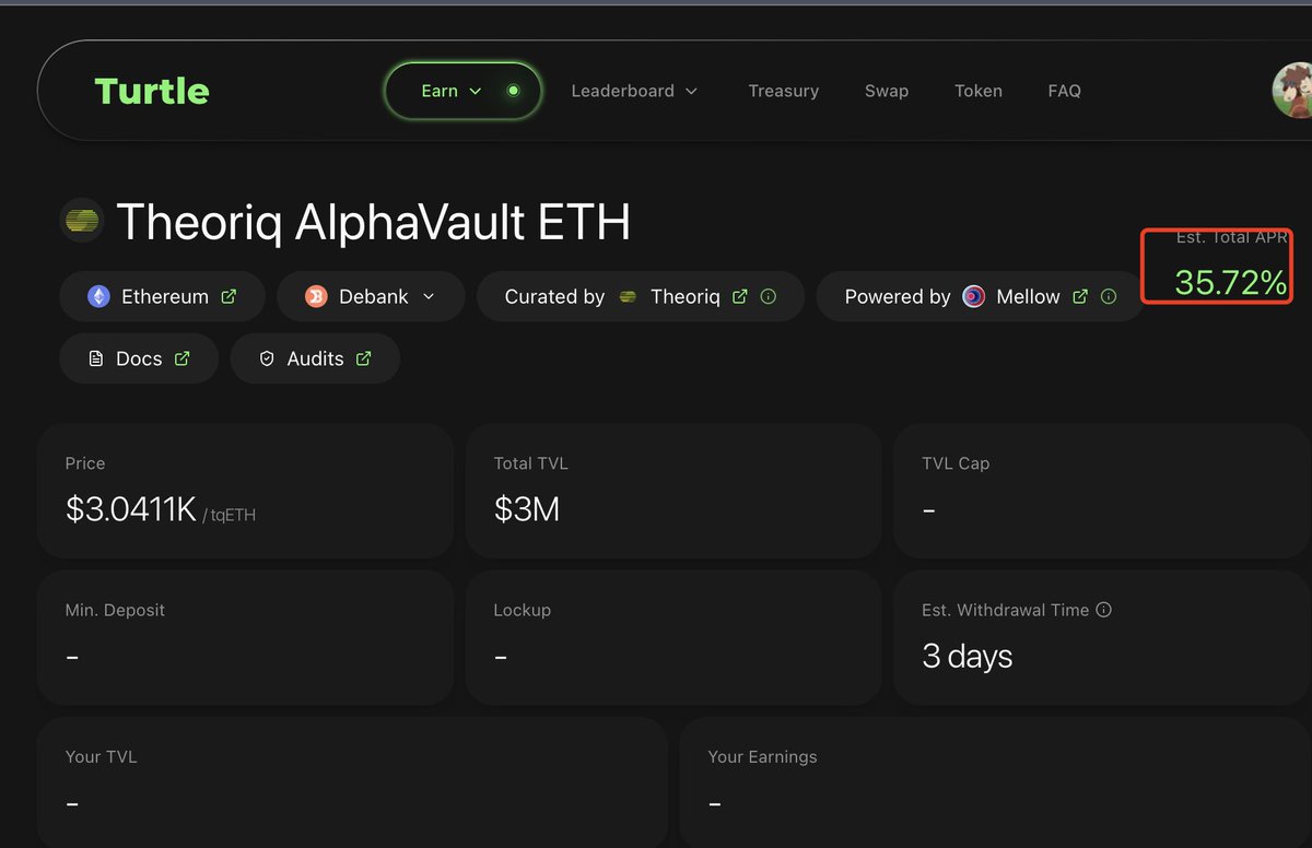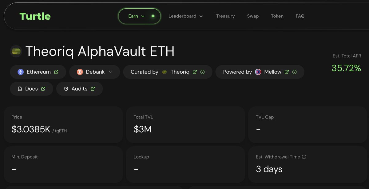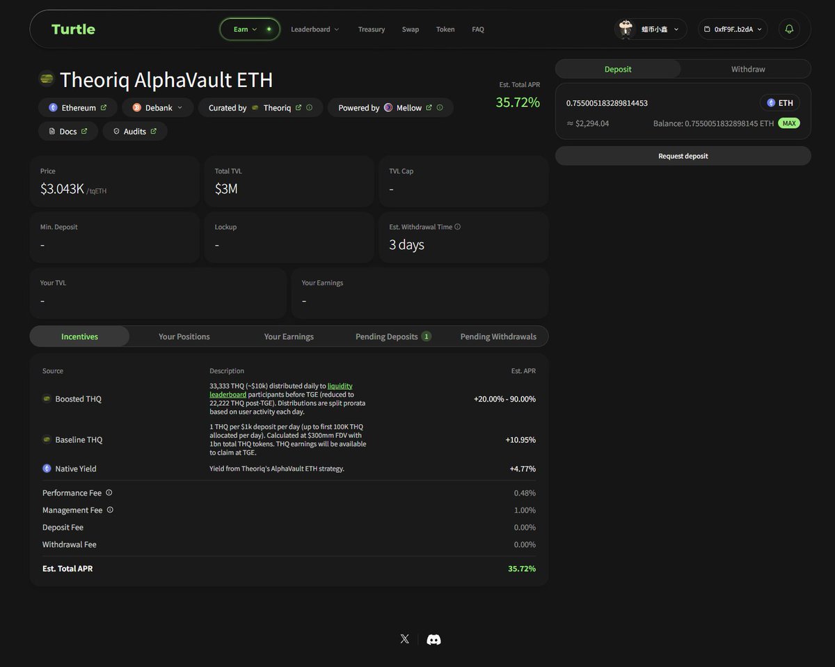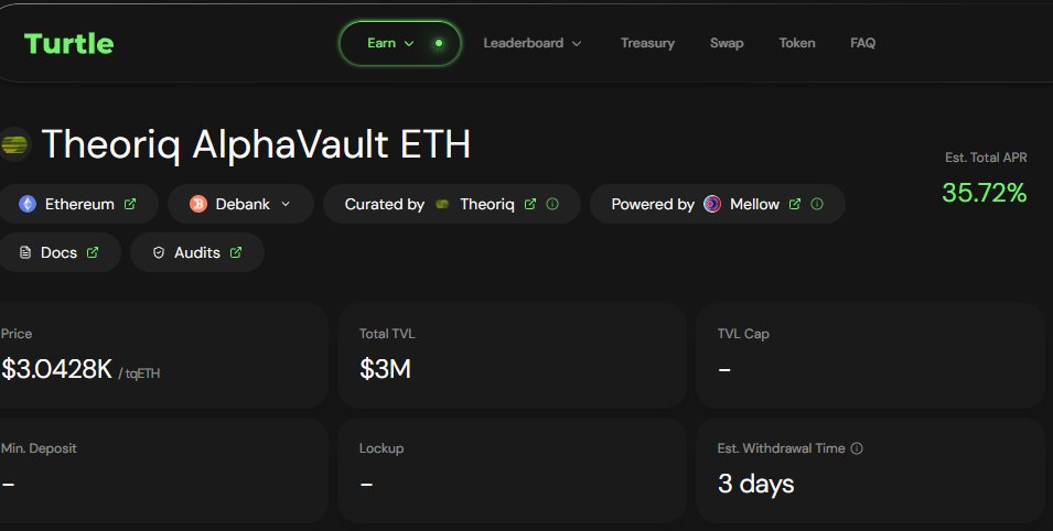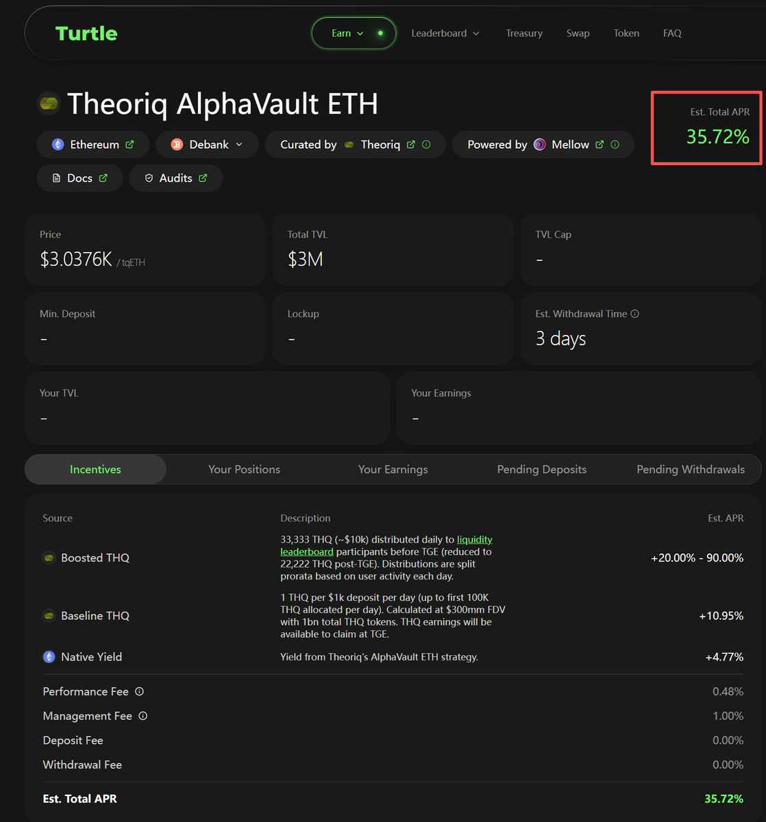 合作之后,AlphaVault 会作为 Turtle 的优质入口之一接入平台生态,未来 Turtle 用户可以直接体验这套“AI 管钱”的工具,参与策略池、赚收益、拿激励;而 AlphaVault 这边也能获得一大波真实活跃流动性,加速金库成长。前期通过 Lido 策略他们已经吸了 8000 万美金的 ETH 存款,这波流量加成,只会让系统更快成熟。