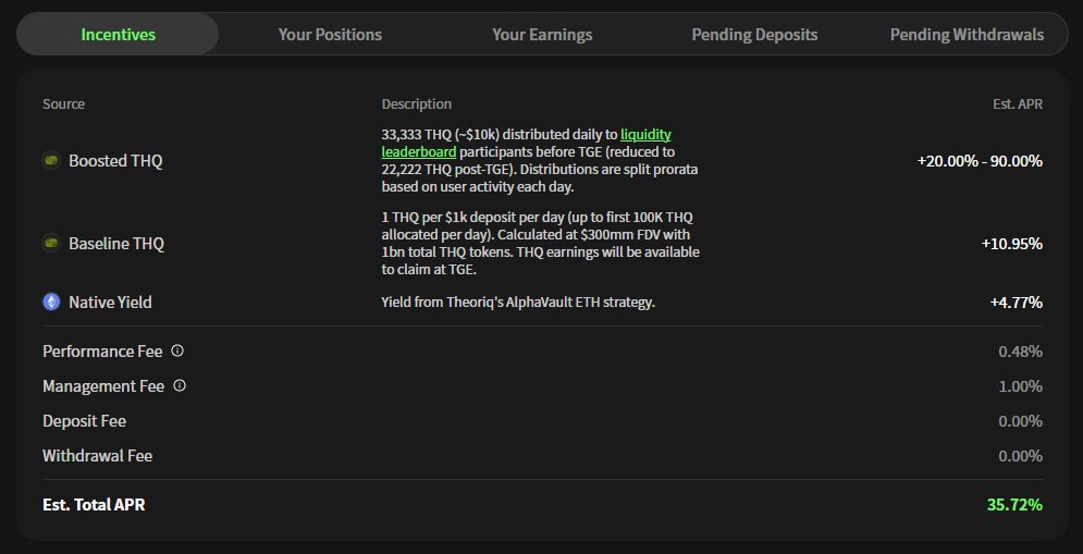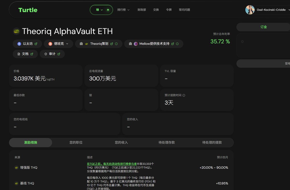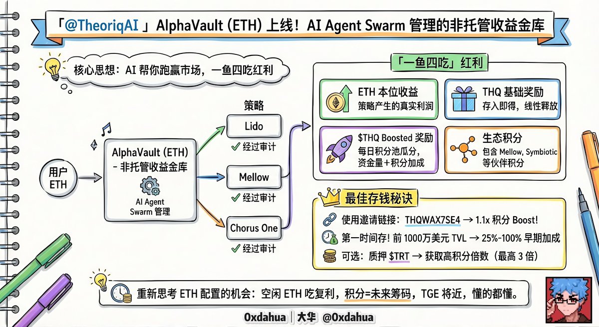 Theoriq 的 AI 管理 ETH 收益金库 AlphaVault 正式上线,头矿年化 35%+,活动仅 90 天,总奖池 1000 万枚 $THQ(总量的 1%)。