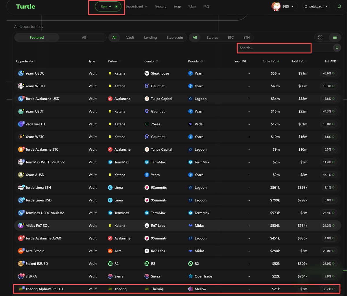 🌟 首先是 AlphaVault,属于比较成熟的链上自主收益方案之一,然后 Turtle 主要是帮助新兴协议展示价值,并提供一些LP和流动性