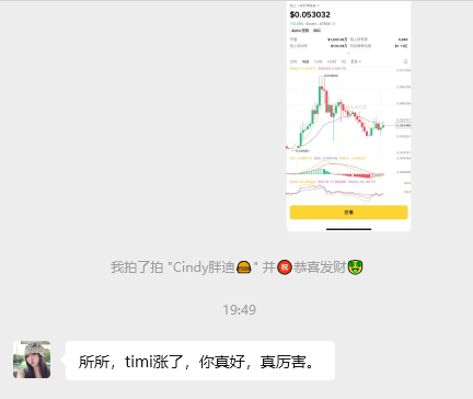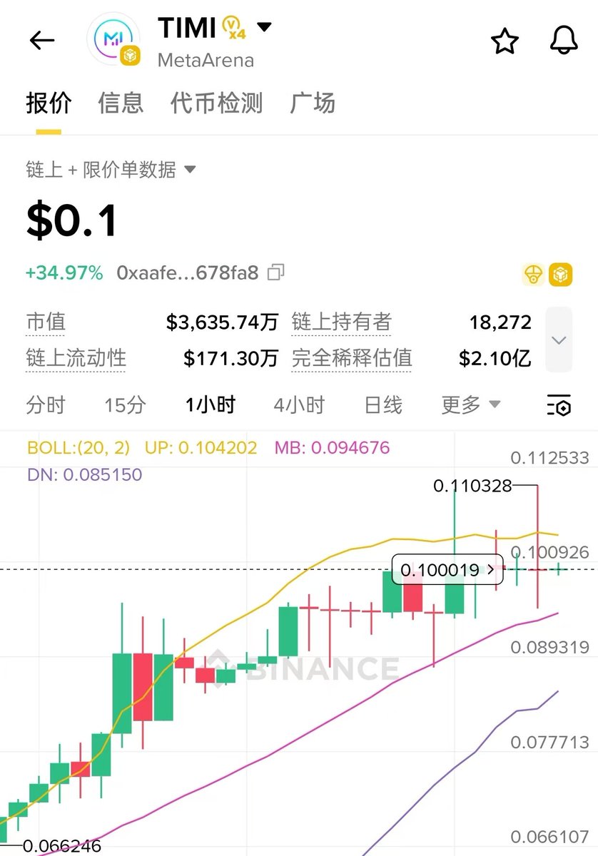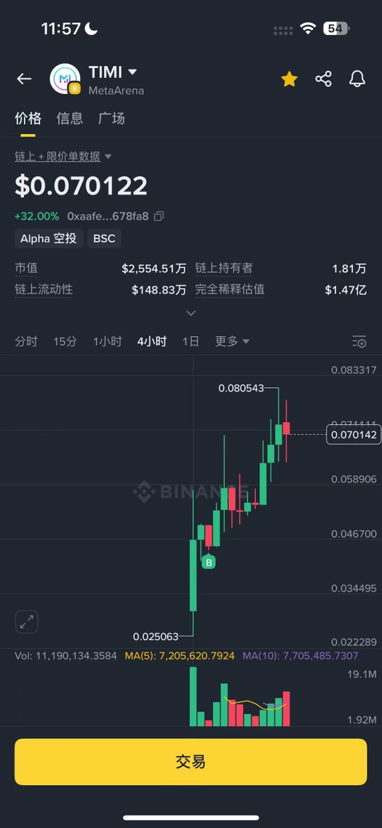 昨晚追了点 $TIMI 美滋滋,这一波该我赚了吧!!追的原因很简单,狗庄正在强势拉盘。现在是节节新高阶段,买入的位置越来越高。最近也不少大V在研究和买入,牛的。 这两天拉了有50个点了,研究了盘口,买盘左脚踩右脚,抛压几乎没有,这走势有点妖,狗庄拉盘起来一般没顶,昨天追了点今天准备灭0了,稳的。 链游板块现在刚启动,情绪刚升温,通常第一个被推上去的,就是预期最强的那个。目前来看,$TIMI 基本是板上钉钉。从基本面来看 @MetaArenaGaming 也是很稳,要产品有产品 要叙事有叙事 要生态扶持有扶持,基本全面了。 风来的时候跟紧了, $TIMI 至少再拉个翻倍起步,可以控制仓位,分批找位置上车吧。