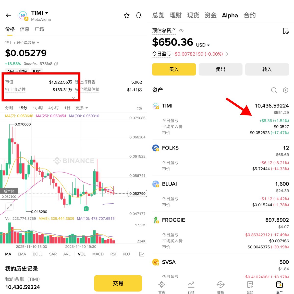 我被名字骗了,刚开始以为是腾讯 TIMI (天美) 来币安抢热度,结果打开一看,是 MetaArena 的平台币 $TIMI 11月 9 日上线了币安 Alpha。 MetaArena @MetaArenaGaming 是一个面向开发者的 Web3 游戏综合平台,以 ZK (零知识证明)技术为中心游戏引擎,为游戏运营提供基础支持,为用户提供类似 Web2 的体验,代币为 $TIMI 。 而《Final Glory》 是 MetaArena 平台上的第一个主打游戏,上线首日突破了 10 万日活,这也是 Sei 链上的第一个 3A 级MMORPG 游戏,游戏包可以在 Windows、安卓及 IOS 三个平台下载,在线同台竞技。游戏里的稀有物品,例如坐骑,未来将以NFT的形式在Gamefun Marketplace上进行交易,而开发者也可以在平台上发布内容和虚拟物品,并直接获得 $TIMI 代币奖励。 整个平台还在早期,$TIMI 上了币安 Alpha 后,K 线走势不错,背后是由 Sei 基金会战略投资的项目,但融资金额尚未公开,细节还比较少,喜欢玩游戏又看好 Sei 链的,可以先卡个位置。之前的板块轮动以 $ZEC 为代表的隐私币再到以 $FIL 为代表的存储币,如果热点轮动到游戏板块,参与早期的游戏板块,静待时机。(DYOR)