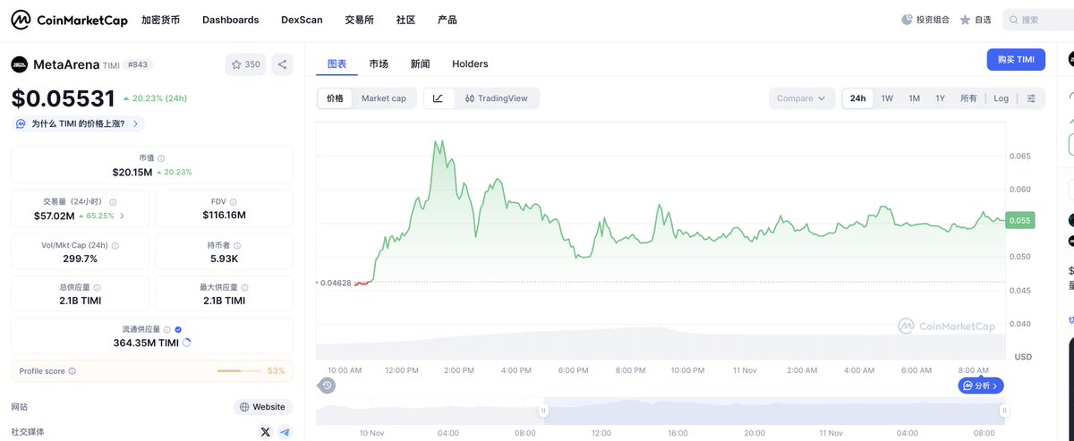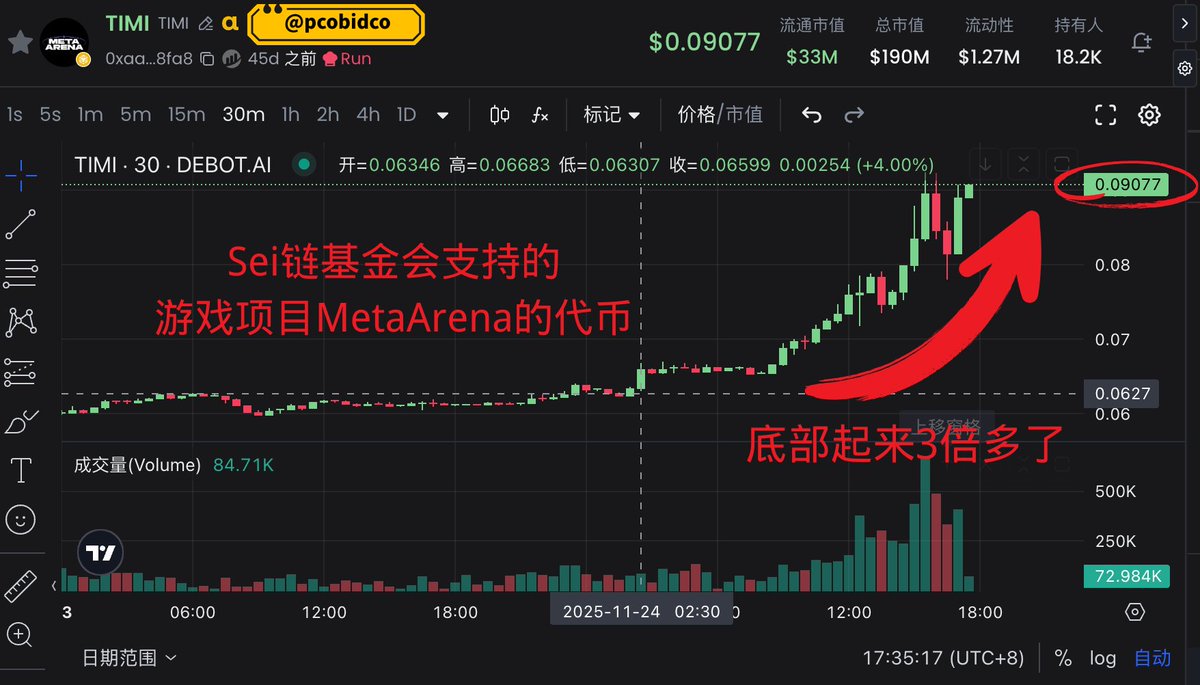最近上了币安 #binance Alpha的Sei生态的代币真的需要多关注一下!上一个一晚上拉几倍的是Yei的 $CLO ,前天晚上上线的MetaArena @MetaArenaGaming 的 $TIMI 也很猛! MetaArena 是Sei链 @SeiNetwork 上专门为 Web3 游戏开发者提供的基础设施。 团队虽然是匿名的,但是拿到了包括Sei基金会在内的330万美金融资,应该是有点东西在的。 MetaArena 背靠 Sei的高性能架构,生态价值循环已经跑通了。 ZK 负责验证,AI 负责执行, $TIMI 在生态中承担的角色也很明确:AI 计算任务的结算货币/ ZK 验证服务的支付工具 / 链游交互的价值载体 / 生态收益的回购标的 代币总量21亿,目前市值26m,流通量17.4%。也属于高控盘项目了。可以重点关注一下。🤔