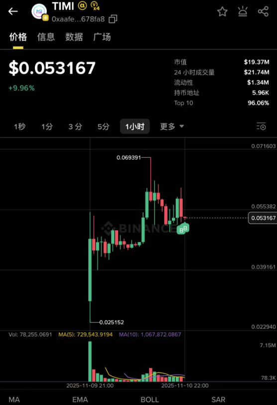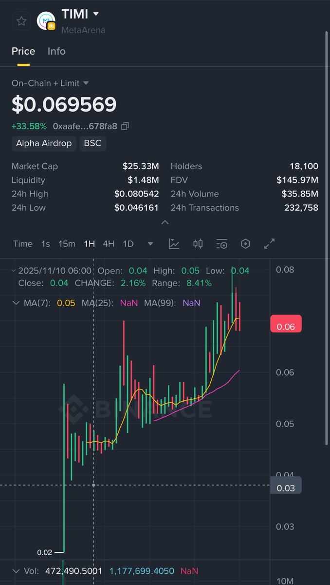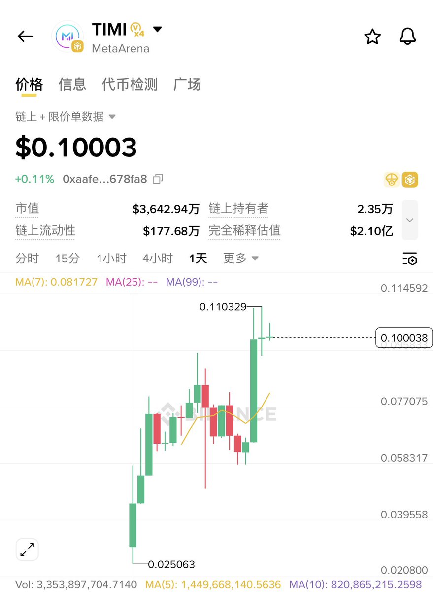 做晚追了点 $TIMI 美滋滋,这一波该我赚了吧!!追的原因很简单,狗庄在拉盘 链游憋了一年没动静,结果新周期一开,最先冲出来的不是老人,是 $TIMI,AI+gamefi这两个结合起来叙事力度确实很大 跟进看了一下它是少数 “产品先跑,币价后跟” 的项目。本身币是小流通 + 链游生态强需求,这种结构怪不得有点情绪最近就直接起飞了,不讲道理。 今天拉了40个点有,看了看盘口 买盘左脚踩右脚像,抛压几乎没,这走势有点妖,狗庄拉盘起来一般没顶,昨天追了点今天0.09突破了,很稳!!! 链游板块现在刚启动,情绪刚升温,通常第一个被推上去的,就是预期最强的那个。目前来看,TIMI 基本是板上钉钉。 风来的时候跟紧了, $TIMI 再拉个翻倍可能,分批找位置上车吧