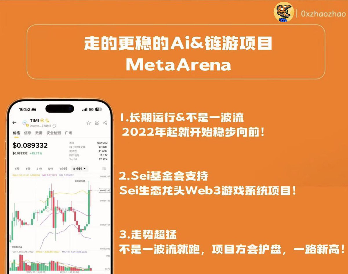 2022-2024主线是Eth-Layer2。 而接下来的主线叙事 阿zhao认为是「Perps & 预测」+「大Ai」两个方向。 在现在的「大Ai」里, 能早期参与的项目并不多, 大部分都是要去社区当艺术家&唱跳Rap的, 就不如蹲一蹲Binance Alpha里的机会了。 在已经上 Alpha 的 AI 项目里, $TIMI 是目前背景、走势、护盘能力最硬的那一个。 MetaArena @MetaArenaGaming 从 2022 年就低调开整, 已经三年了, 不是一波流土狗。 核心叙事一句就能说完: ZK 执行层 + AI 智能代理 + 链游。 更狠的是, MetaArena 已经拿下 Sei @SeiNetwork 基金会的 convertible grant资助, 属于Sei生态里明牌扶持的那一档。 AI 赛道里大部分的项目都是讲完故事就跑, MetaArena 是极少数「长期运营|还会护盘」的项目。