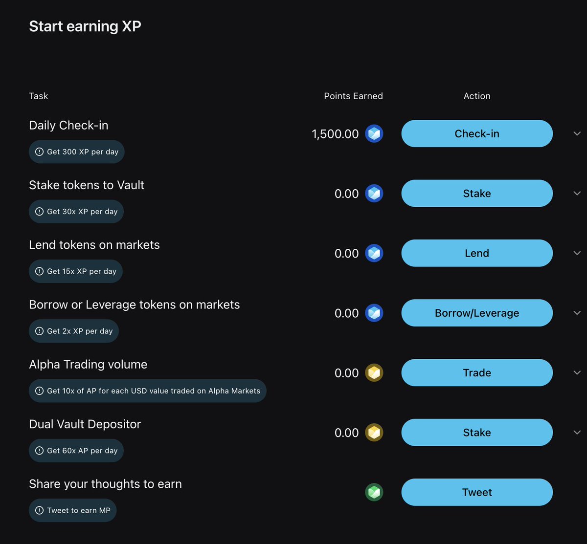 目前活动才进行到第 3 天,我自己的策略很简单,先把 5 天签到这个最低成本、确定性最高的任务完成,再决定要不要参与 stake、lend、borrow 这些加速项。