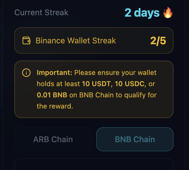 - 在为期 5 天的签到期间,在 BNB Chain 钱包中持有 ≥10 USDC/USDT 或 ≥0.01 BNB(满足其一即可)。