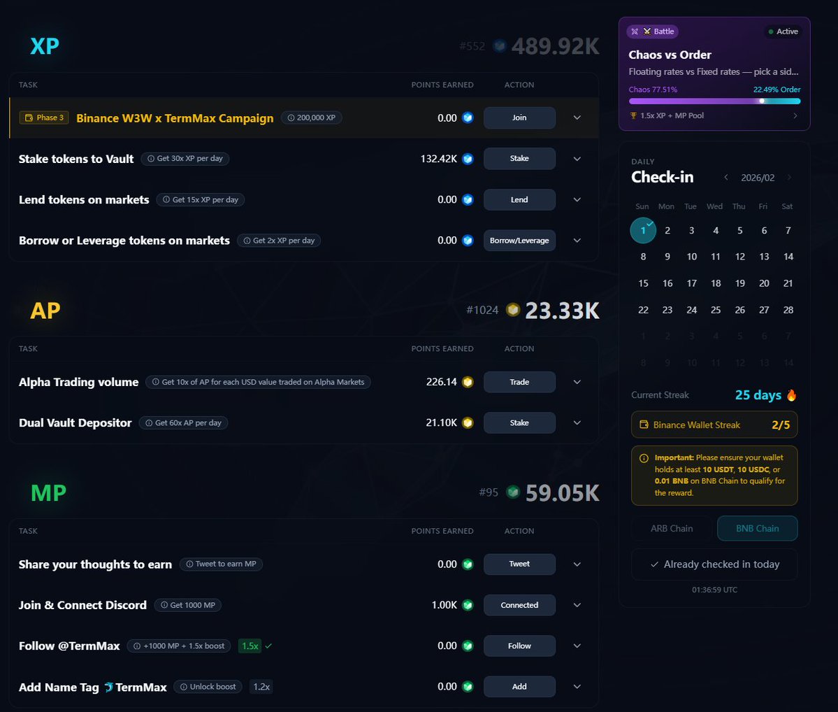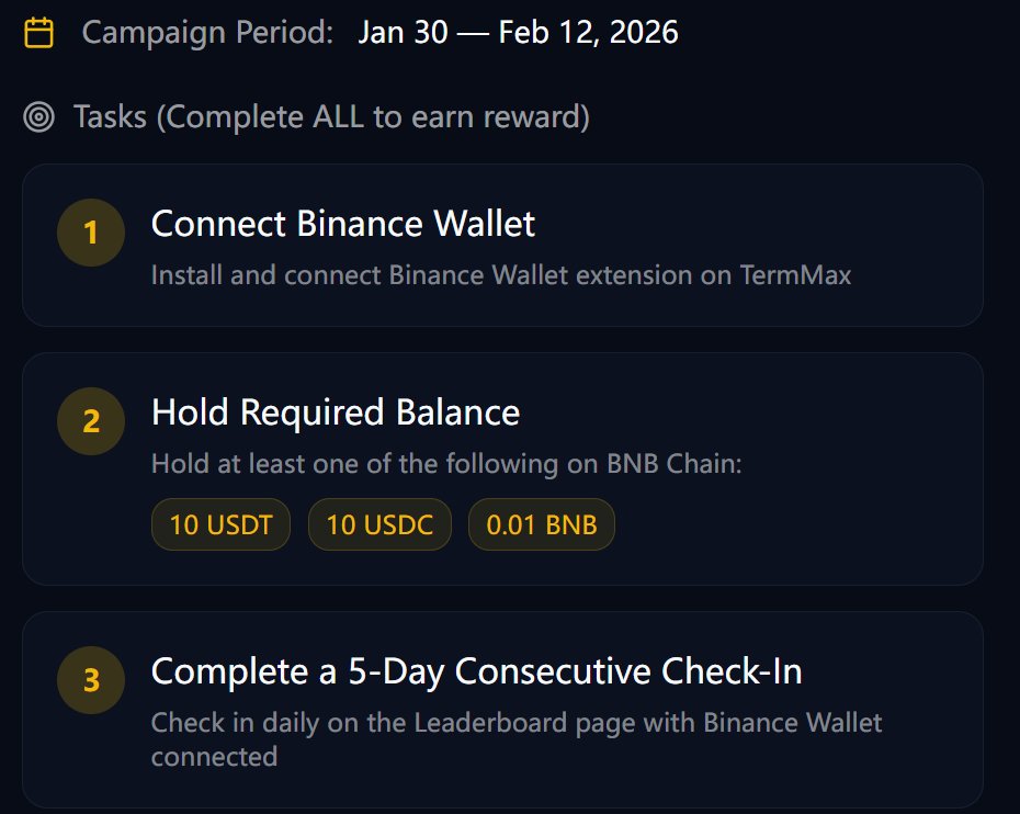 新手奖励: TermMax 新用户,连续 5 天使用币安钱包登录即可解锁「连胜追逐者」徽章和 5万 XP!新用户的总共可获得 25.15 万 XP 积分。