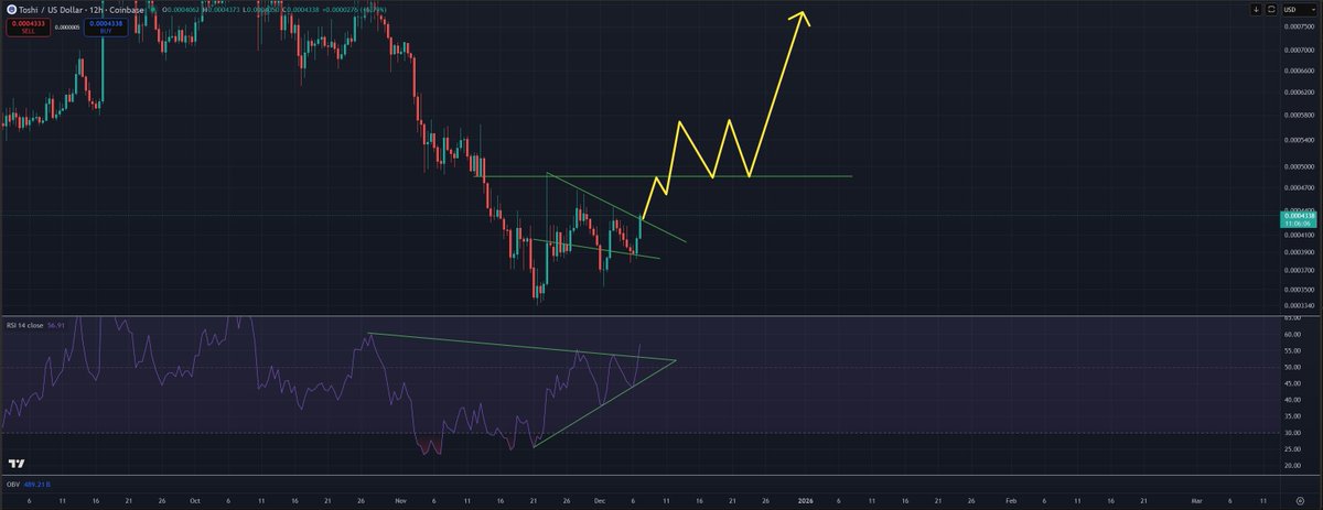 Exciting times are ahead of us $TOSHI has now officially completed its correction, now breaking out of the downtrend Early days but I think we have a nice 1-3 months of expansion for the Blue Cat Get above $0.00046 and things get exciting, including likely all time highs Now onto the weekly close Toshilio