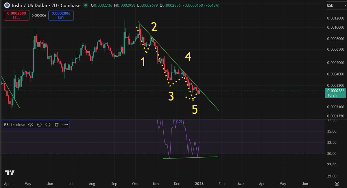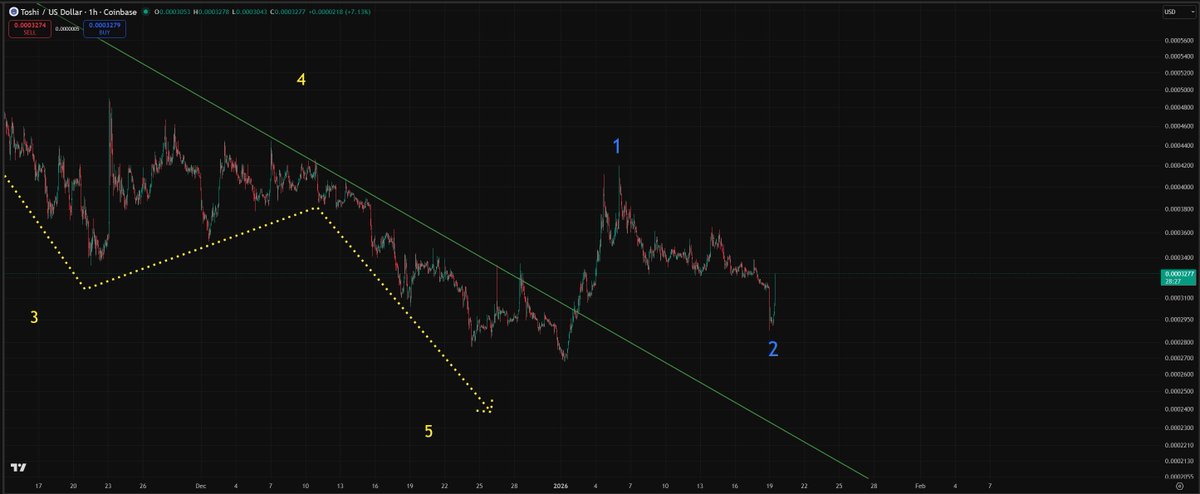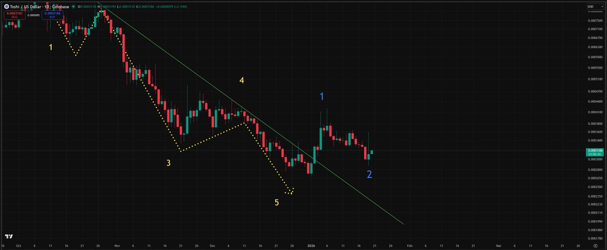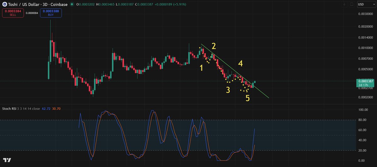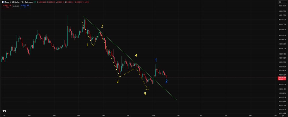 Looks like $TOSHI wants to end the week off with a pretty deep correction Everything looks fine when it comes to this possible wave 2 before the massive wave 3 leg up Don't really want to close below $0.0003 but still looks good here Toshilio