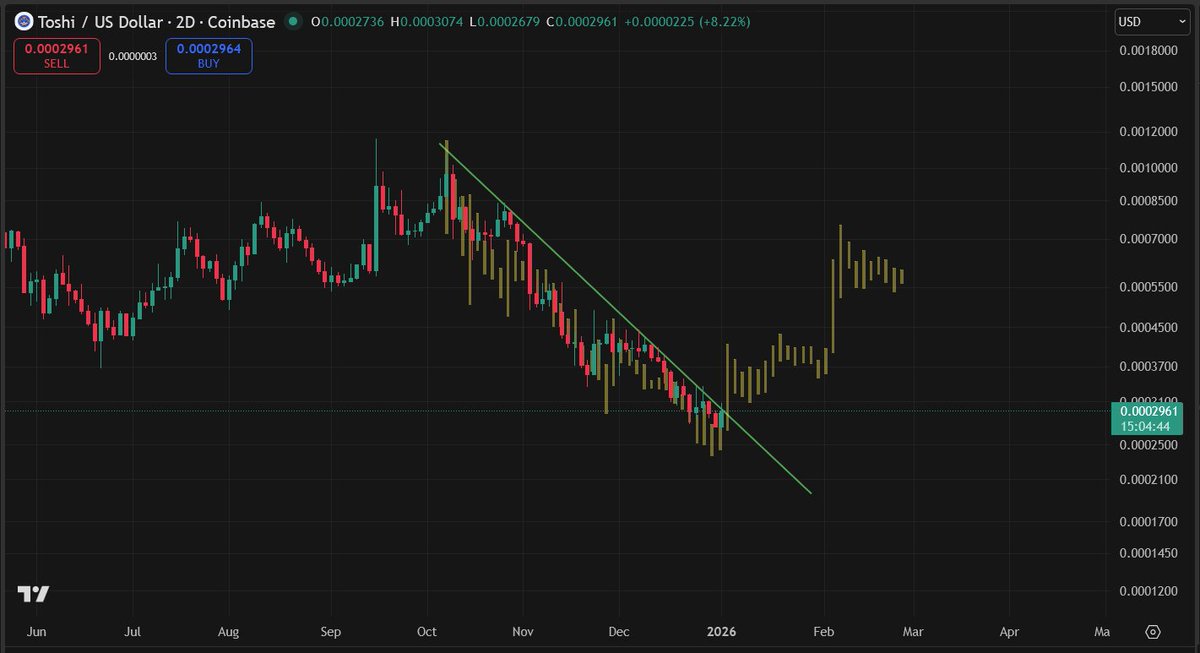 Exciting times are ahead of us $TOSHI has now officially completed its correction, now breaking out of the downtrend Early days but I think we have a nice 1-3 months of expansion for the Blue Cat Get above $0.00046 and things get exciting, including likely all time highs Now