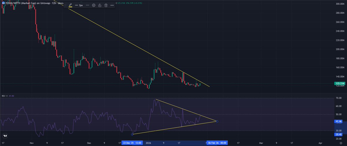 Have a sneaky feeling $TOSHI is about to break out of this 3 month long downtrend to make new highs Let's hope a strong $BTC week and we can see some nice relief for the blue cat Toshilio