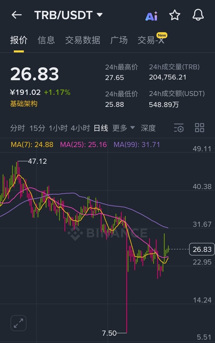 8. $trb 这个妖币,每次行情都有它,下次跌到30刀我就买着放着,亏不了多少钱,涨起来就疯,吓人。