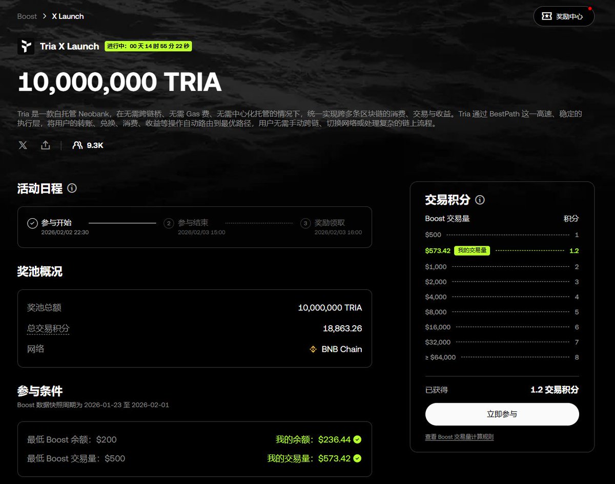 用户可通过申请 Tria Premium 卡参与消费返现。此外,可参与 OKX Boost 池活动,满足指定的交易金额和交易额要求(例如200金额+500交易额),以瓜分 $TRIA 奖池奖励。