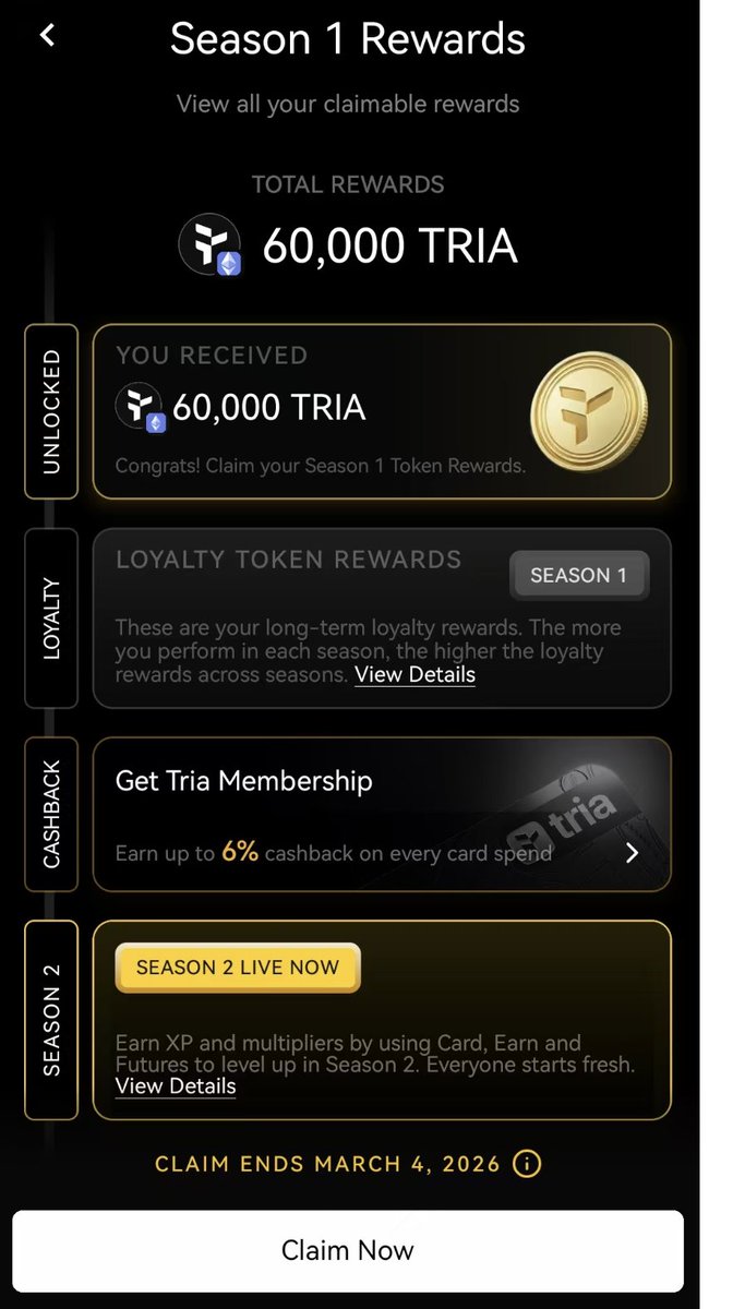 1, 返现形式升级:项目方确认,其 Premium 卡的最高6%消费返现将直接以稳定币形式发放,而非其原生代币 $TRIA。这提升了返现价值的确定性和用户体验,被社区视为重大利好。