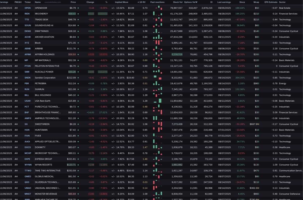 Here are the stocks reporting earnings today, by options volume, with implied moves: OpenDoor $OPEN 13.10% Iris Energy $IREN 10.46% $TTD 14.64% $SOUN 11.57% $DKNG 7.87% $ACHR 7.51% AirBnB $ABNB 6.77% $AFRM 10.33% $PTON 10.02% $TTWO 6.48% See LIVE earnings on Unusual Whales