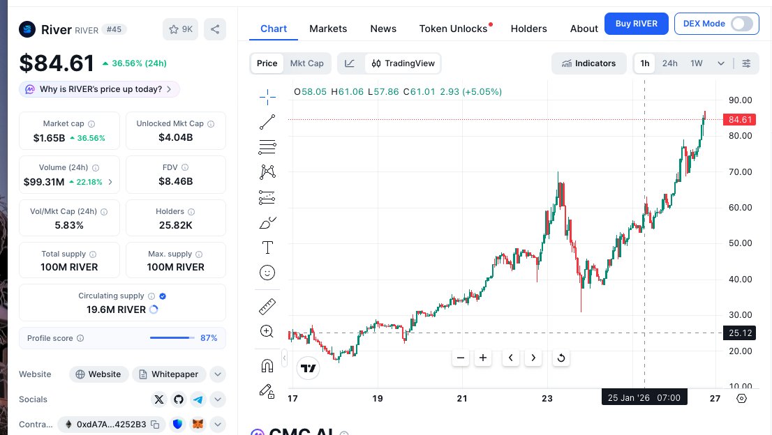 最近刷到不少因为 RIVER @RiverdotInc 改变生活的帖子,换车看房的都有,说不酸是假的。作为 2026 年开门红的代表性项目,从 1 月 1 日的 $4 起步,到 1 月 27 日最高触及 $90 附近,不到一个月时间,阶段涨幅接近 25 倍,这已经不是运气好能解释的了,必然有几把刷子。