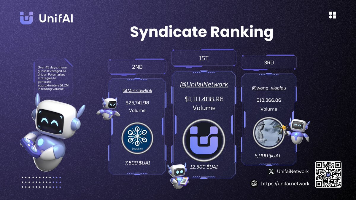 如何参与 Polymarket AI Agent 交易竞赛 注册:https://t.co/rig6BlMcvw 先看奖励 总奖池:60,000 $UAI ,现在$UAI价格大约是 0.14,8400 刀。 时间线:12 月 3 日 – 2026 年 1 月 17 日 Syndicate(战队)排行榜(25,000 $UAI) 排行榜奖励分配 🥇 第 1 名:12,500 $UAI 🥈 第 2 名:7,500 $UAI 🥉 第 3 名:5,000 $UAI 奖励将直接发放给战队,再由战队分配给其社区成员。 参与方式 用户报名参赛时,可通过加入某个战队或选择独立参赛。 每位战队成员所产生的交易量将汇总到该战队的总交易量。 战队按社区驱动的总交易量进行排名。 个人 ROI 排行榜(25,000 $UAI) 排名奖励 🥇 第 1 名:12,500 $UAI 🥈 第 2 名:7,500 $UAI 🥉 第 3 名:5,000 $UAI 内容创作者奖励池(10,000 $UAI) 创作者可通过在 X 上发布与竞赛相关的内容并@UnifaiNetwork,同时包含自己的推荐链接来参与。 奖励拆分 第一名:3,500 $UAI 第二名:2,500 $UAI 第三名:2,000 $UAI 随机 10 位合格参与者共享:2,000 $UAI 如何参与个人排行榜 1. 在 UnifAI 上创建你的 Polymarket AI Agent:https://t.co/rig6BlMcvw 2. 向策略至少部署 $100 3. 直接加入个人排行榜或通过战队加入(若希望同时参与两项排行榜,建议通过战队加入),我的战队名字叫「哆啦 A 梦」😄,目前暂居第二。 4. 在 UnifAI 平台同时跟踪两项排行榜的进度:https://t.co/wwk31BCoi0 可以同时运行多个 AI 代理。系统会始终选取收益最高的代理用于排行榜。个人榜,我目前第三