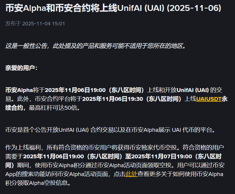 最近 UnifAI 的动作一直不停,几乎每天都有重量级合作项目爆出,我就知道离发币不远了,没想到来的这么快,今天他们的治理代币 $UAI 官宣上线了 #Binance Alpha 上线时间表: 11月06日19:00: 上线币安 Alpha 11月06日19:30: 上线币安合约 UnifAI 是一个由自主 AI 代理组成的基础设施,彻底简化用户和开发者的 DeFi 操作流程。参与即获利,智能驱动增长。他们目前和多个热门项目都有合作,如 @0G_labs@humafinance@SentientAGI@brevis_zk@myshell_ai@OpenledgerHQ@GoKiteAI 等等,都是比较知名的实力派项目,由此可见,项目方的实力也没得说。 目前最后悔的是没多搞几个低保号,亏了亏了,下次这种确定性的机会得多上几个号~ @binancezh @BinanceWallet @UnifaiNetwork #Binance
