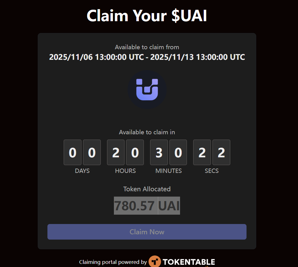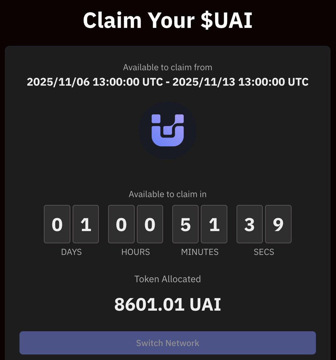 早安!先来个空投开开胃, UnifAI $UAI 空投查询已上线啦~ 传送门:https://t.co/qLW4Z4lgDe 不过现在只能查询,还不能领 空投领取时间:11月6日 21:00,持续至11月13日。 不过币安 Alpha 时间比这个早2个小时,在19点就可以领了,如果你想买注意这个时间节点~ 之前跟着我的推文参与过的朋友们,赶紧去查查吧!注意看你的钱是在哪里,如果是它的那个内置钱包,需要导出内置evm钱包的私钥就能查到了。 ▰▰▰▰▰ $UAI 总量10亿 部署在 BSC 链上 合约地址:0x3e5d4f8aee0d9b3082d5f6da5d6e225d17ba9ea0 代币分配详情: 基金会和运营:20.75% 营销:18.75% 团队和顾问:15% 社区空投:13.33% 流动性:7% 投资者:5.35% $UAI 实用性包括:支付 AI 代理服务、治理投票、质押奖励、收入分享等。,潜力还是不错的~