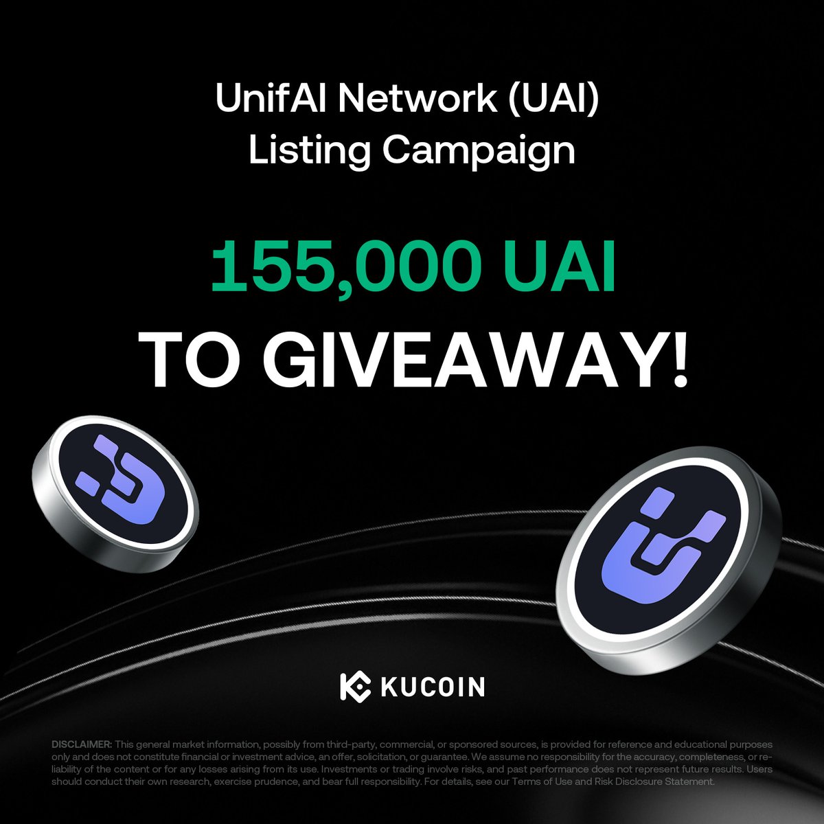 🎉 Celebrate $UAI on #KuCoin with an exciting giveaway! 🎁 10,000 UAI for 100 winners! How to enter: 1️⃣ Follow @kucoincom & @UnifaiNetwork 2️⃣ Like, RT & Quote: "Trade $UAI on #KuCoin!" + Tag 3 friends 3️⃣ Fill this out: ⏰ 48 hours