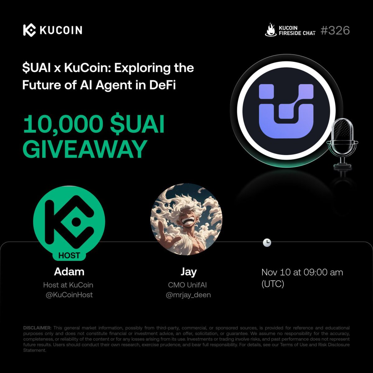 🎙️ Join our #KuCoinFireSideChat with @UnifaiNetwork! Discover how UAI is pioneering the next wave of AI agents in DeFi, transforming automation, intelligence, and financial innovation across decentralized ecosystems. 🤖 🎁10,000 $UAI to win! 1. Follow @kucoincom, @BC_KuCoin & @UnifaiNetwork 2. Join the space: https://t.co/5EJClQo1HY 3. Complete Gleam form: https://t.co/MHRWJgADhk Show your support to $UAI on #KuCoin now⤵️ https://t.co/FHJ5a10Tet