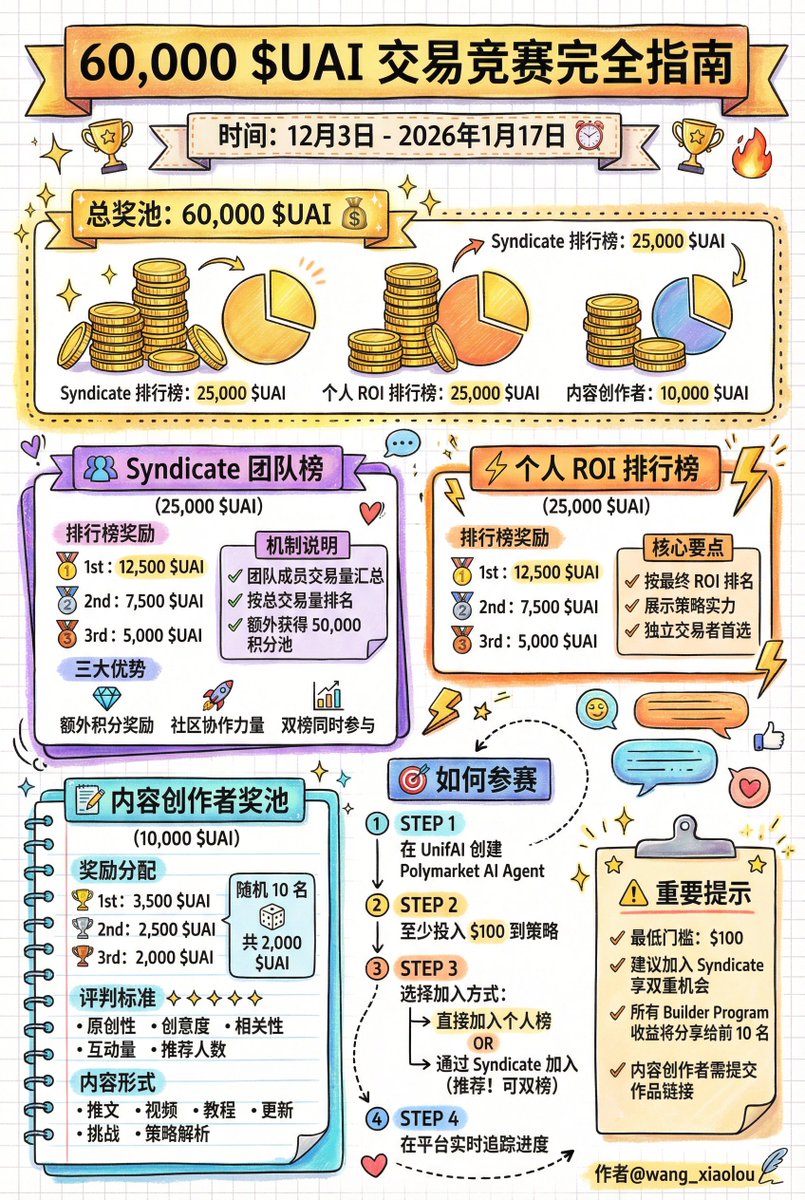 竞赛完整信息总结: @UnifaiNetwork ⏰ 时间线 开始:2025年12月3日 结束:2026年1月17日 持续时间:约6周 💰 总奖池:60,000 $UAI 三大赛道: 1️⃣ Syndicate 团队榜(25,000 $UAI) 🥇 第一名:12,500 $UAI 🥈 第二名:7,500 $UAI 🥉 第三名:5,000 $UAI 额外福利:50,000 UnifAI 积分池 核心玩法:团队交易量汇总排名 2️⃣ 个人 ROI 榜(25,000 $UAI) 🥇 第一名:12,500 $UAI 🥈 第二名:7,500 $UAI 🥉 第三名:5,000 $UAI 核心标准:最终投资回报率 3️⃣ 内容创作者奖池(10,000 $UAI) 🏆 第一名:3,500 $UAI 🏆 第二名:2,500 $UAI 🏆 第三名:2,000 $UAI 🎲 随机10名:共2,000 $UAI 策略建议: 💡 加入 Syndicate 可同时参与两个排行榜 💡 内容创作者可以边参赛边做内容赚三份收益 💡 所有 Polymarket Builders Program 的收益将分享给 Top 10 💡 最低门槛仅 $100,参与成本不高