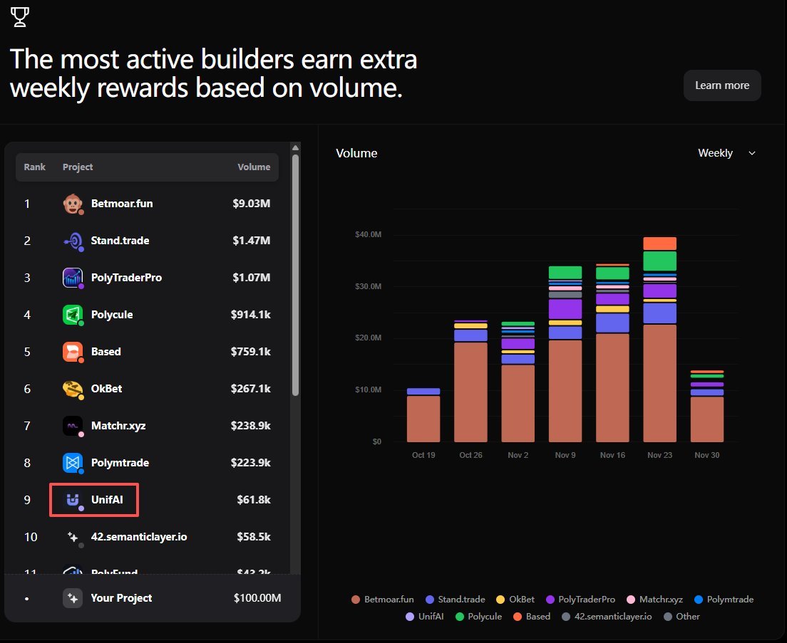 连续霸榜Polymarket的神秘项目,背后到底站着谁? 先问兄弟们一个问题: 你见过哪个项目,从上线第一天起,就稳坐Polymarket Builders榜前十,整整三个月没掉下来过? 还有就是它凭什么? 今天就带你们深挖一下,一个真正让AI「动手赚钱」的协议,是怎么跑出来的。 哦对了,这个项目叫 @UnifaiNetwork( $UAI ) 牛逼不是吹的,先看几个硬数据: ①总交易量破4000万美元 ②Polymarket Builders榜稳居前五 ③入选官方100万美元建设者计划 ④ $UAI 在币安ALPHA上咔咔拉盘 但是现在所谓的AI概念币太多了,咱们就实实在在的看看项目能解决啥问题吧。 其实很多DeFi玩家,最大的痛苦是策略想得很好,执行起来稀碎 盯盘、调仓、跨平台操作、无常管理... 这些琐碎又耗时的操作,吞噬了大部分精力。 而UnifAI的做法很直接:给你一个听得懂人话的AI代理。 你不需要会写代码,不需要懂API,你只需要告诉它你的逻辑: >如果这场选举民调差距超过5%,就在Polymarket加仓 >如果BTC跌破6万,就在Drift开空对冲 >如果这个池子的APY高于20%,就放10%资金进去 然后,你就可以去睡觉了。 目前UnifAI合作了很多热门项目如Kite、 @SentientAGI 、Huma、 @brevis_zk ,投资方又是HashKey Capital、Finality Capital这些老牌机构,机构也不傻,肯定是看中项目的长期价值才投的 其实AI+DeFi这个赛道,一定会出几个大项目。但关键在于谁能把AI从辅助工具升级为自主决策体 因为能进化的才是智能的,不过AI面临的问题也一大把 比如AI策略的黑箱问题,多协议集成的安全风险,监管的不确定性等,后面好用又不给用了也很正常 但这些,也正是早期机会所在。 毕竟,在AI开始真正动手赚钱的时代,我们投资的已经不是工具了。