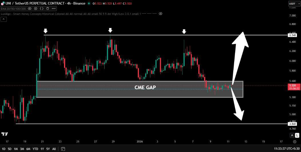 UNI gonna hunt ur SL, trade wisely if scalping $UNI made triple tops got rejected hard now hanging on FVG a hard rejection from here will send it to $5 but if it goes back then next locked target $6.5 plan your entries where it moves simple as that, lock in fr perfect R:R