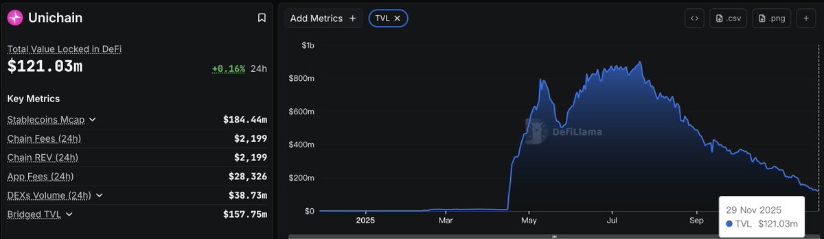 Unichain的TVL较高点下降了80%,从Gauntlet风风火火操刀 $UNI 流动性挖矿开始,Unichain迎来一个短暂的高峰,矿工赚的盆满钵满,但并没有抓住机会创造出有机需求。如果Unichain持续低迷,会极大影响UNI的天花板,因为Uniswap的交易量和规模已经基本固定,同时面临的挑战者众多,压力很大。