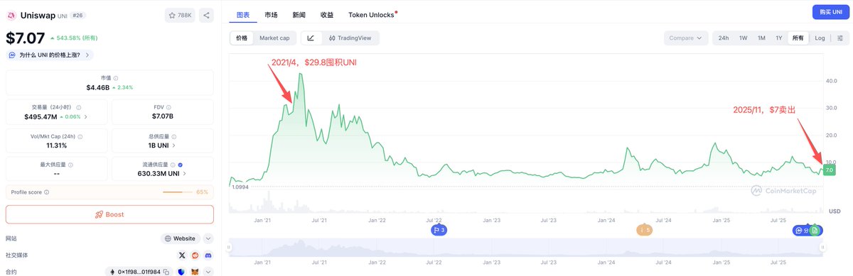 惨烈,UNI 钻石手持有 51.2 万 $UNI 长达 4 年半时间,结局是亏损 $1165 万 (-76%): 他在 20 分钟前把 51.2 万 UNI 转进币安,这些 UNI 是在 4 年半前 (2021/4) 从币安提出来的。 他基本是在山顶上囤积的 UNI,当时价格 $29.8,这些 UNI 价值 $1529 万。而在 4 年半后的今天,UNI 价格 $7,这些 UNI 价值缩水到 $364 万。 地址:https://t.co/phujK1WIeU --------------------------------------------------------- 本文由 @Bitget 赞助|Bitget VIP,费率更低,福利更狠
