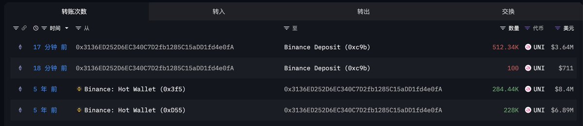 UNI 上市时买入、持有 5 年之久的钻石手今早清仓 249.3 万枚 $UNI ($1062 万),5 年持仓仅获利 $172 万 (+19%)。 前段时间以 $3,313 的均价清仓持有 5 年时间的 10.1 万枚 ETH ($3.34 亿) 而获利 $2.69 亿的巨鲸/机构。今天在 3 小时前清仓了同样持有长达 5 年时间的 UNI:把持有的 249.3 万枚 $UNI ($1062 万) 全部转进了 Binance。 他是在 UNI 刚上市时 (2020 年 10 月) 买进的这些 UNI,买进均价 $3.57。在持有了 5 年多时间后的今天,以 $4.26 的价格全部转进了 Binance,仅获利 $172 万 (+19%)。 他的 ETH 跟 UNI 都是在 2020 年买进的,同样是持有了 5 年时间,ETH 获利 400%,而 UNI 仅获利 19%。 地址:https://t.co/zoTb48REBb --------------------------------------------------------- 本文由 @Bitget 赞助|Bitget VIP,费率更低,福利更狠