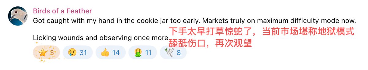 「我认输了」的委婉版本 “我正舔舐伤口,再次观望” 鸽子在 tg 群表示这次下手过早了,看这意思要么是割肉要么在扛单,此前他曾公开表示加仓了 $ETH 和 $SOL,并短期看好 UNI,目前 $UNI 跌破 $6.5 防线,即他的先前论证已失效