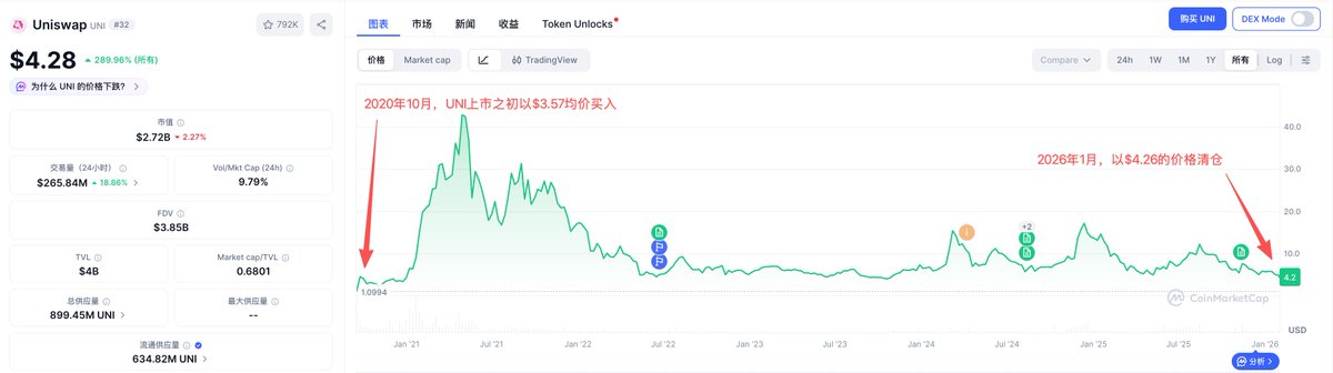 简单的问AI还是不靠谱!有小伙伴告诉我Uniswap治理通过的最新提案及白皮书修正,原定每年2%的通胀率(约2000万枚UNI)的固定释放已经调整,社区通过调整国库管理策略,目前这部分代币的释放并非自动进入流通,而是由治理金库控制。倾向于通过销毁机制或延迟发放来减轻抛压。去年运维总开支约为499万美元,其中高管及核心团队薪酬支出达387万美元。 $UNI 最终没全换仓,只换了一半去 $NEAR 。