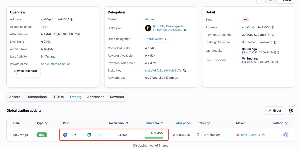 According to @zachxbt, a whale wallet dormant for 5 years just swapped 14.45M $ADA ($7.08M) for $USDA 9 hours ago. Due to low liquidity, he only received 847,694 $USDA, taking a massive $6.2M loss.