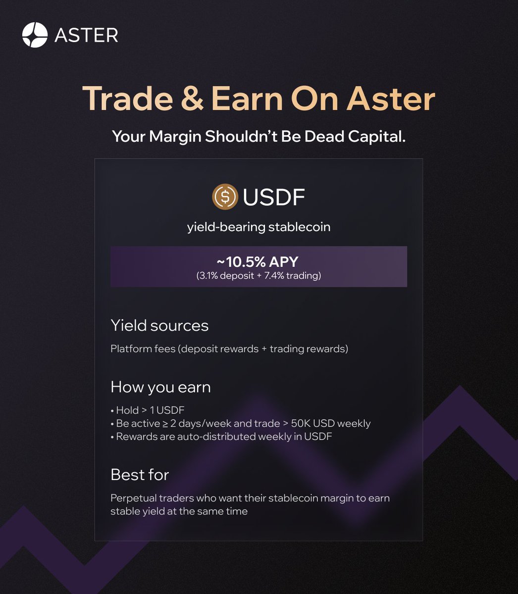Aster还是再主推自己的 $USDF ,流动激励年化可以达到10%,目前也是吊打Ethena的USDe,闲钱都可以换过去理财 这么一看, $USDF 既可以当保证金开单,又可以做理财拿钱,只需要满足每周 5 万美元的交易量即可获得奖励 如果 $ASTER 用处更多的话就更牛了 目前 @Aster_DEX 的S4还在卷 刷的人其实不太多,现在还有「一鱼三吃」活动 有常规交易习惯的兄弟们可以去做做 https://t.co/Qola8quO0x