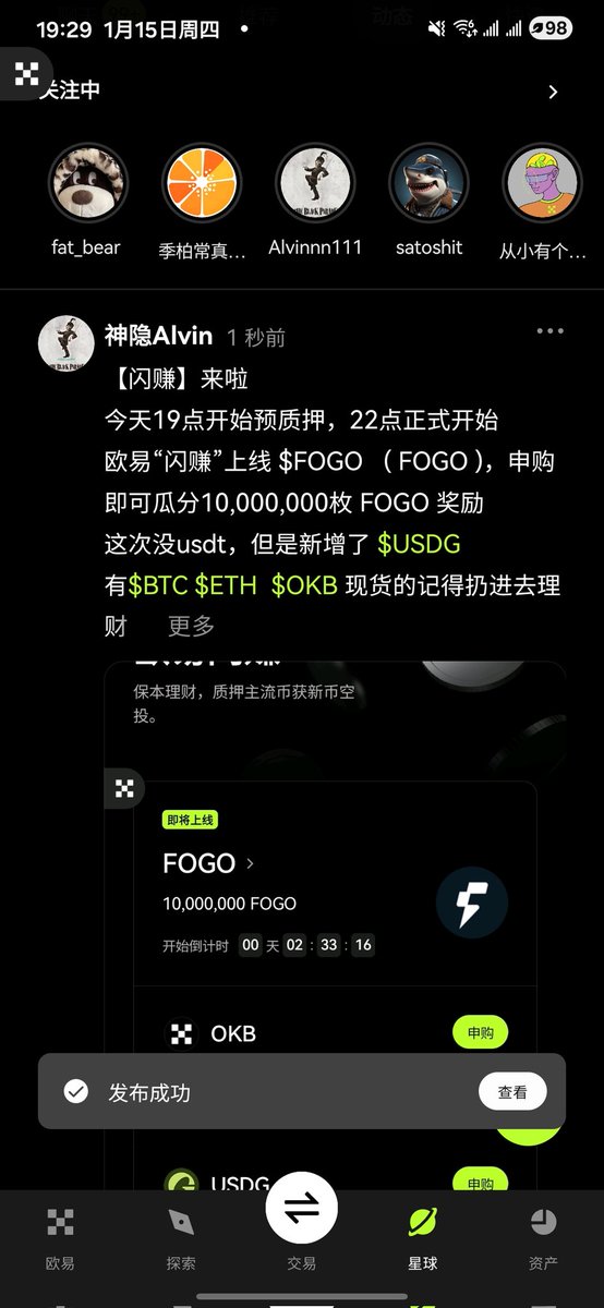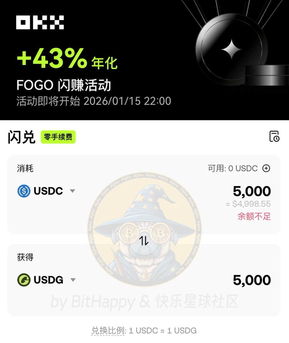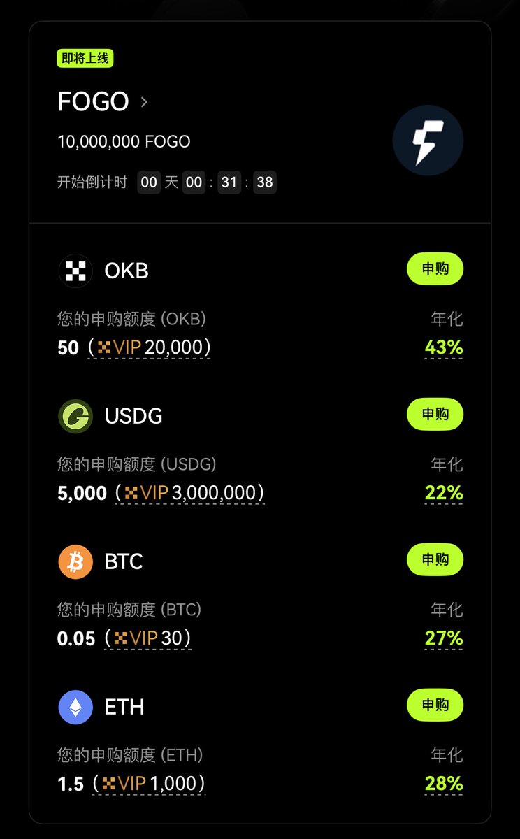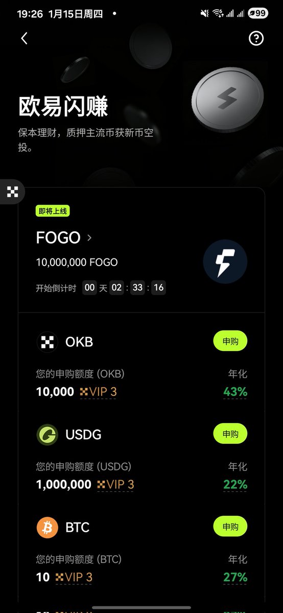 OKX闪赚上了 $FOGO 理财,对比上期三连项目,在 $OKB 大饼二饼基础上新增 $USDG
