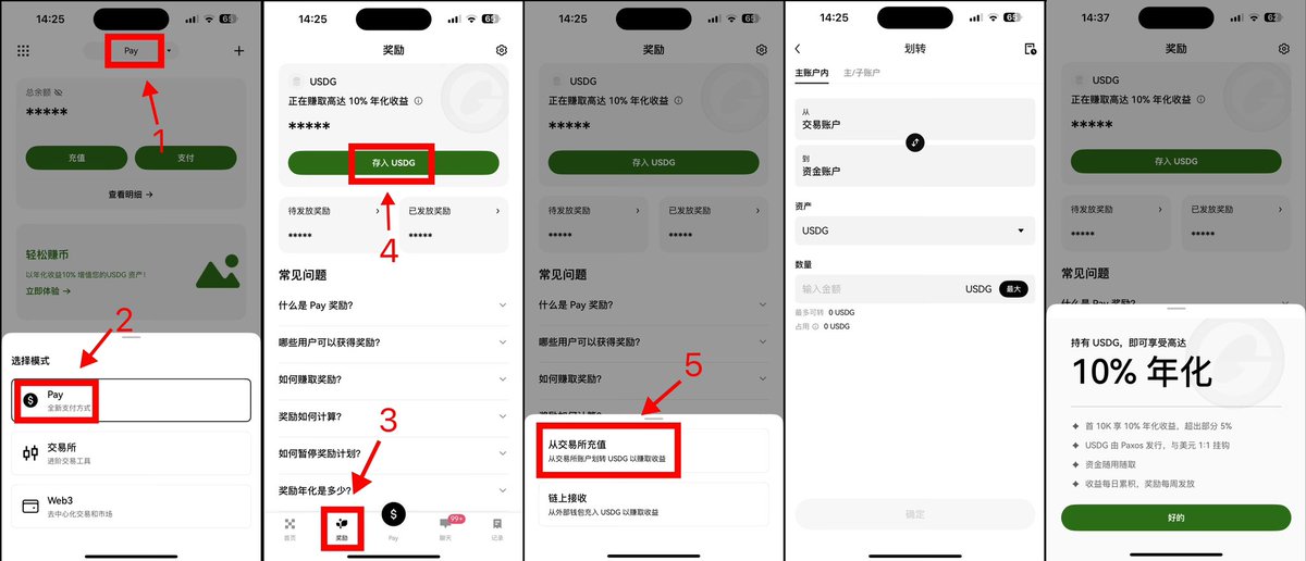 存入路径 OKX顶部切换——OKX Pay —— 奖励 ——存入USDG
