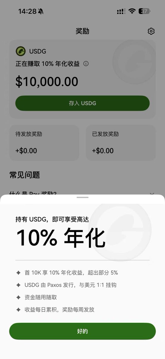 在 OKX Pay 中存入的前 1 万个 $USDG 可享受 10% 年化收益。