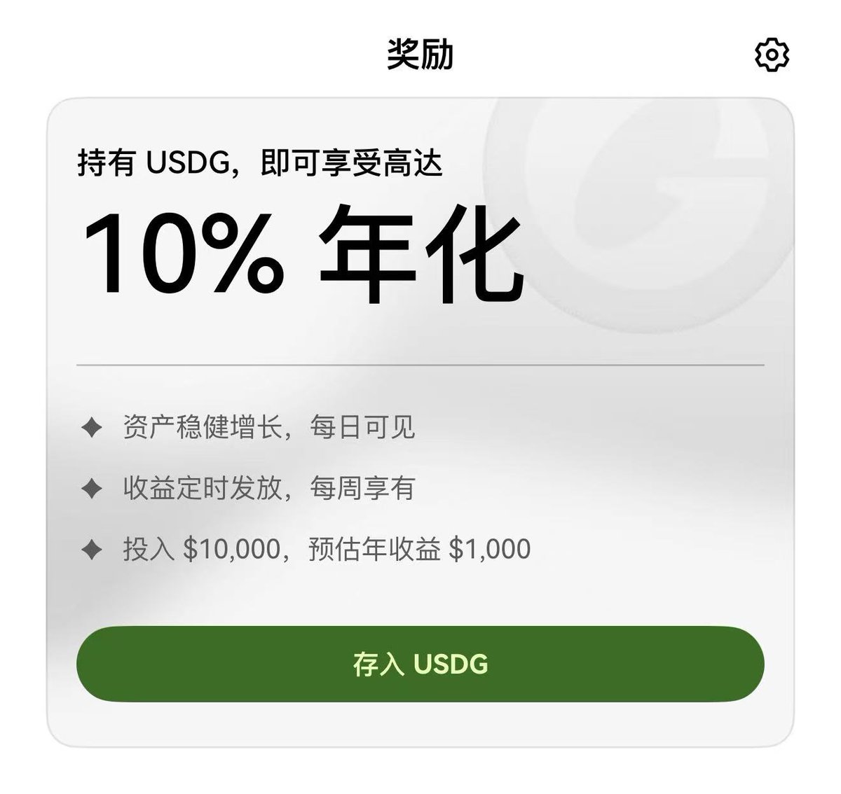 存 $USDG ,前一万刀享受年化10%,超出部分5%并且无上限。