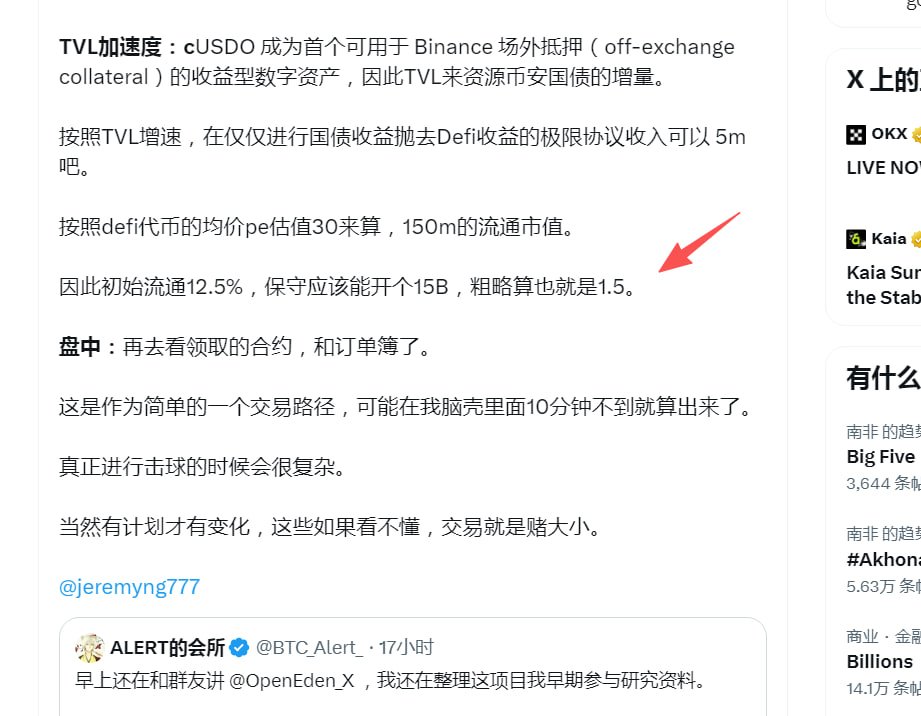 如引用推文所见, $eden @OpenEden_Fdn基本开盘的估值是可以计算的,alpha也是按照比较保守的估值去开盘。(图1)