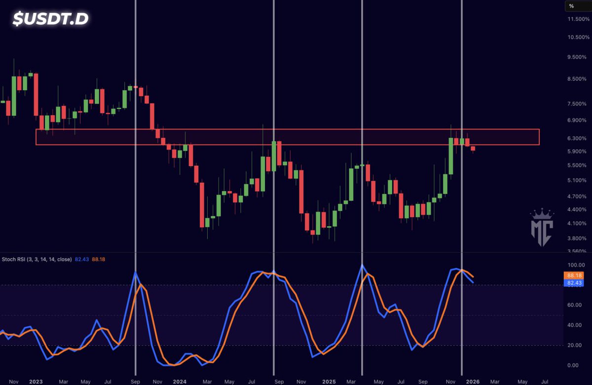 USDT DOMINANCE IS SIGNALING A POTENTIAL REVERSAL. $USDT.D just formed a doji candle on the 3-day timeframe. A breakdown in $USDT.D typically aligns with rising inflows into crypto markets. Stablecoin dominance is at a turning point.