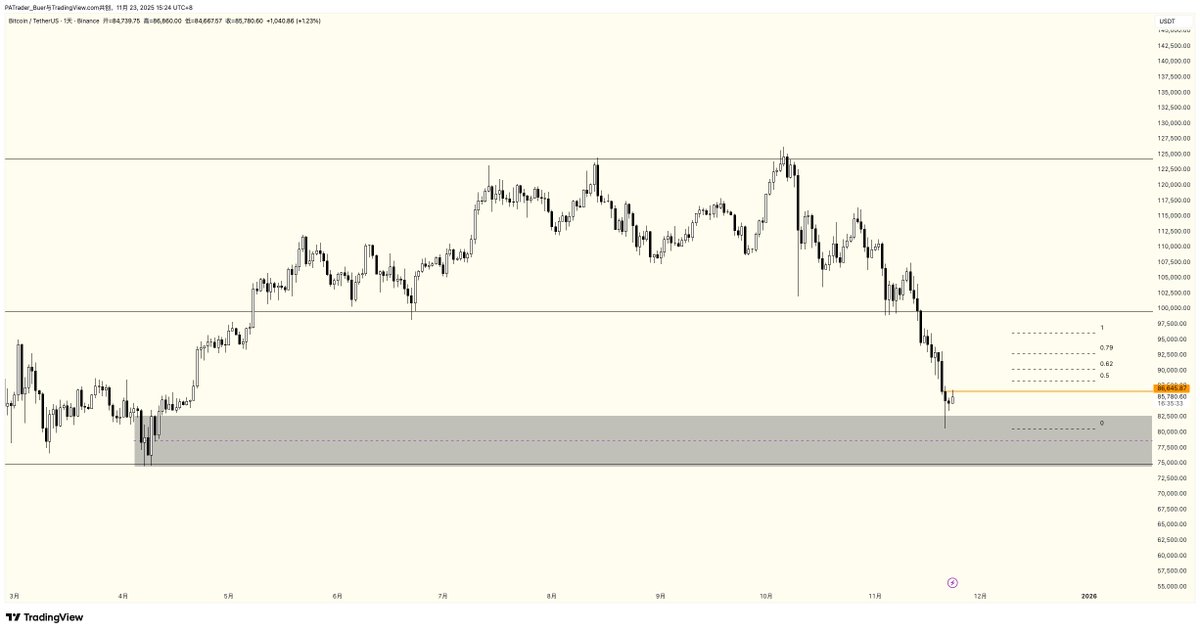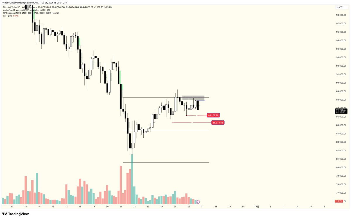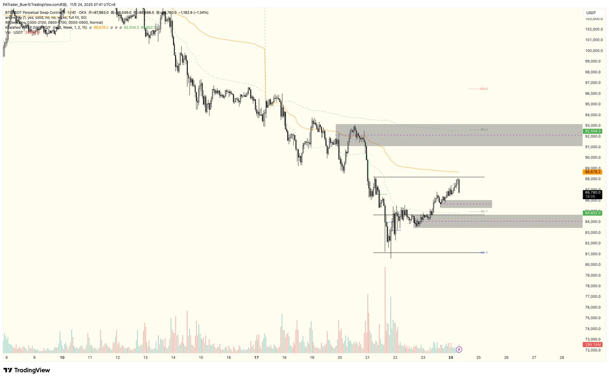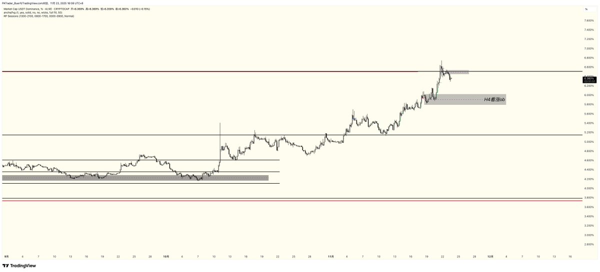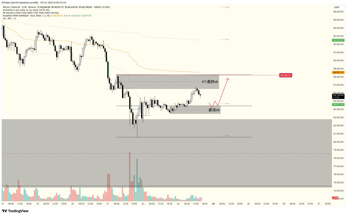 帕尔 $BTC 行情日报——11.23 日线图表 1) BTC这里测试8W 周线ob 后插针目前向上。 2)可以看到主要下跌是周四非农后 ,12月降息降到30% 以下 + nvda 领跌导致,这波下跌直接插针到8 W 关键ob 支撑。 然后美联储理事放消息偏降息, 讲12月降息概率25 点概率拉回71% 。 所以目前状况是消息推动下跌到8 W获得支撑(现货买入), 然后消息反转(跌太多,散户看涨需求)拉到了85 附近。 3) 目前来讲我希望明天收线能到866上方,这样包住了周五跌幅, 下周才有更强的反弹动力。 否则, 反弹力度还是偏弱。 小时图表 1) 目前震荡趋势806-883 可以看到目前在区间内走一个震荡上涨。 如果可以突破883 range—H 那小时msb ,也可以期待进一步向上反弹,目标看92 。 2) 目前这里测试H1看跌ob 后,拒绝目前向下。这里下跌主要合约推动,并存在空头平仓。 现货没有抛售。 3) 所以目前上涨还可以继续期待, 关注回踩看涨ob买入机会。 $usdt.d H4 图表 1) 可以看到usdt.d 这里掠夺了range—H ,上次掠夺在24年8月5 ,当时是49 的低。 2)可以看到这里掠夺后在走一个震荡下跌, 目前来讲,range——H 这里拒绝,那继续下跌, 下跌目标H4看涨ob 。 当然如果再次突破range——H 站稳 ,那BTC要继续跌。