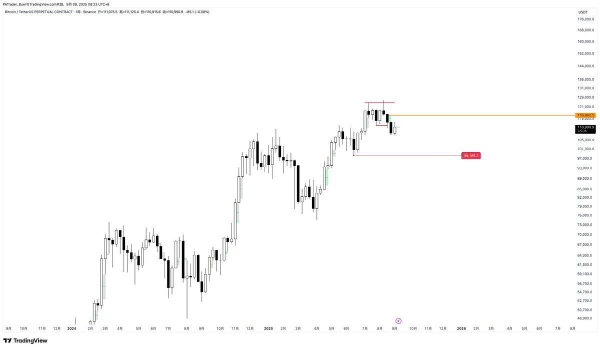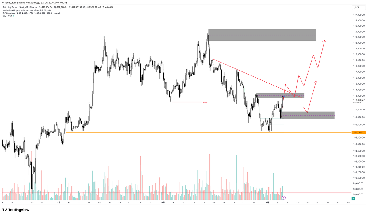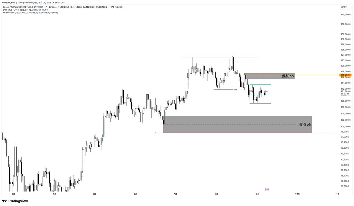 🔥帕尔的 $BTC 行情分析 —— 周报9.15🔥 月线图表 1)月线太大了,除了大佬 和长期主义来讲, 月线只是交易中的一个参考。 2)先说点大的, BTC 突破 7W 后, 已经是另外一个层次了, 我觉得可能不会再见到 7 以下的BTC了。 如果哪天真来个大的黑天鹅插针到 6 附近,那干就行🤣。 所以目前从长远来讲, BTC 跟美股一样走在长牛行情,所以看到的各种大佬猜测到 100W 之类的, 每个人都可以喊, 只是时间问题而已。 3) 抛开想象 信仰 猜测这些长远,回到当下交易来讲,目前BTC 依然处于上涨走势中, 但在各种利好兑现之后, 在没有更多资金流入推动之前, 波动率其实在降低,在一波拉升钱需要进行新一轮的盘整。 4) 所以可以看到目前第三季度 789 三个月一直在围绕 107 -123 震荡,或者可以说 107-116 (实体 K)震荡。 因为本周降息存在, 从月线来讲就是要看能不能站稳 116 ,站稳 116 ,那 有一定概率继续向上去打新高点。 否则来讲, 需要注意回调了(涨不上去的震荡会向下去做进一步流动性获取)。 周线图表 1) K 线结构: 周线向上插针掠夺后, 走震荡下跌后反弹,上周说了 1168 位置周线 fvg 流动性缺口一定会回补,目前已经补完了。 这里现在关键就是 1195 了,这里拒绝 那继续走震荡回调。 下方目标先看下方 105- 98 这是周线级别重要支撑。 如果突破且回来站稳, 那可能就要新高了。 2)本周重点宏观9.18 2:00 美联储利率会议 目前预期来讲是降息 25 个基点。 现在博弈的点一个是 25 还是 50 ,50 是否会引起衰退担忧。 一个是点阵图, 今年还会降低多少。 3) 个人观点: 本周是博弈的一周, 因为上周说的明确流动性目标已经获取了。 现在关键博弈点在 116-1195 ,这是关键位置,关注这里的价格反应。 是直接突破继续新高,还是拒绝下跌。 日线图表 1) 黑色区间是日线震荡区间, 也是本季度行情震荡区间 1073-1233。 2) 可以看到回踩 range——L 构建一个 eql 后,目前向上反弹。 目前行情在 range-eq 这里震荡。 那还是 eq 站稳,我认为会继续向上。 向上先关注目标是 118-1195 这个区间, 然后在向上就是 range—H 123附近了。 如果 eq 这里拒绝向下了 , 那下来先看112 位置 ob 价格反应。 3) 操作建议: 降息前不建议做空 BTC, 你做也就是小短线做波段而已。 降息后,关注 重点位置价格反应再去看是否做空。 目前还是多位置, EQ 位置站稳还是以短多为主。 如果给一个大回调到 112 位置同样还可以关注做多机会。 小时图表 1) 这里反复在讲目前测试 116-1175 H4 看跌ob 后在构建震荡 整个周末就是围绕上边看跌 ob 看涨 ob 震荡。 这里认为不破 115 看涨ob 就是向上看,这是也是上方日线讲的eq 位置。 这里跌破,那就要注意是否会回 112 (目前来看可能不是特别大)。